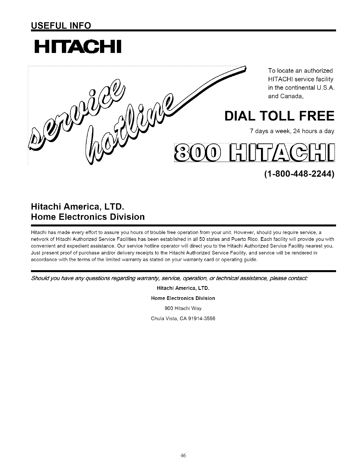 Please fill out your warranty card and mail it to HITACHI. This will enable HITACHI to notify you promptly in the improbable