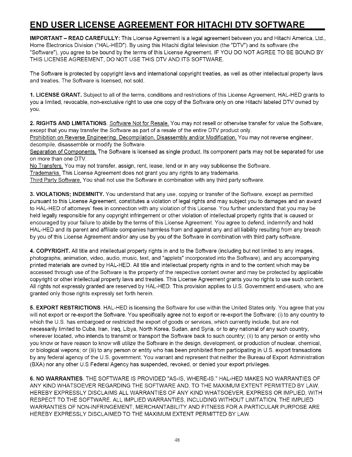 Home Electronics Division ("HAL-HED"). By using this Hitachi digital television (the "DTV") and its software (the
