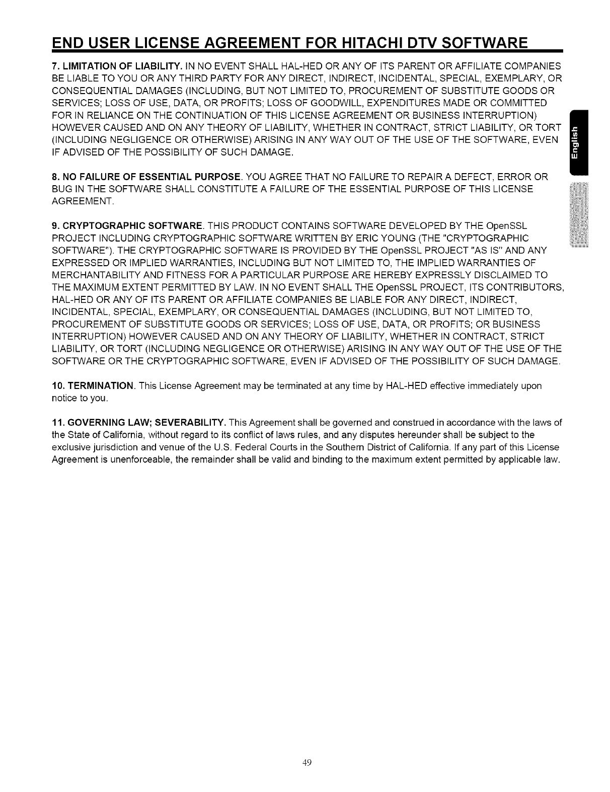 END USER LICENSE AGREEMENT FOR HITACHI DTV SOFTWARE