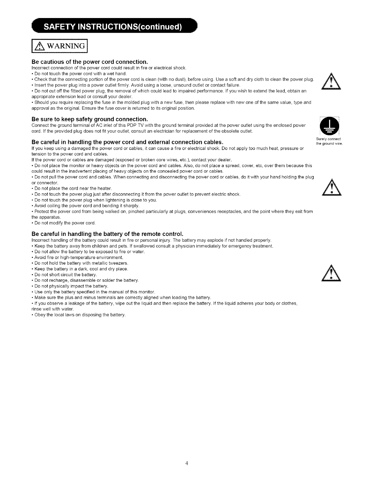 WARNING: • TO PREVENT FIRE OR SHOCK HAZARD, DO NOT EXPOSE THIS PLASMA TELEVISION TO RAIN OR