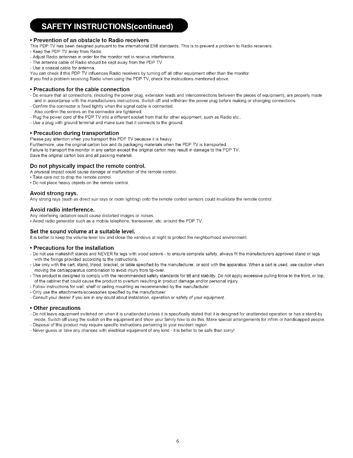Follow all warnings and instructions marked on this plasma television.