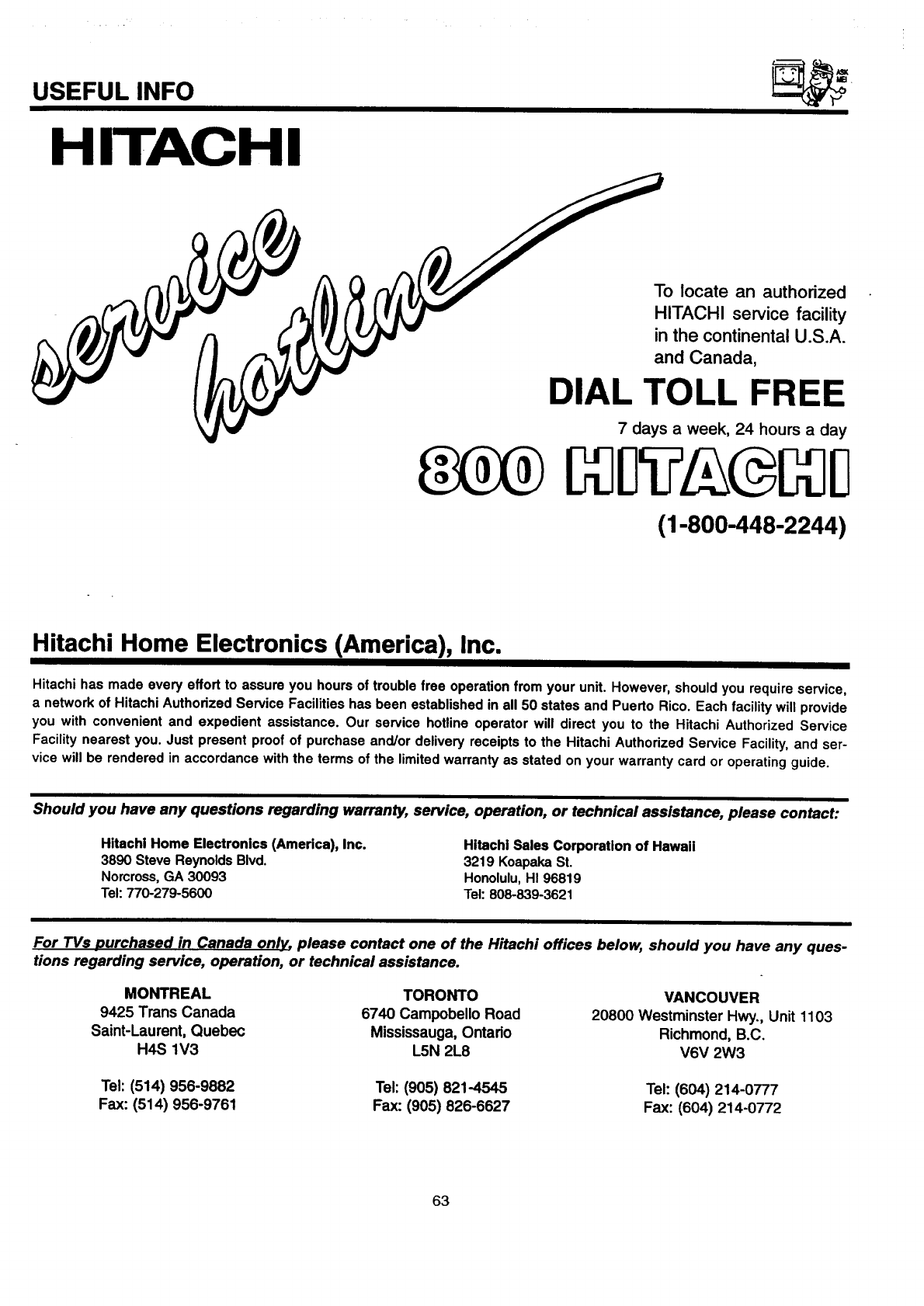 you with convenient and expedient assistance. Our service hotline operator will direct you to the Hitachi Authorized Service