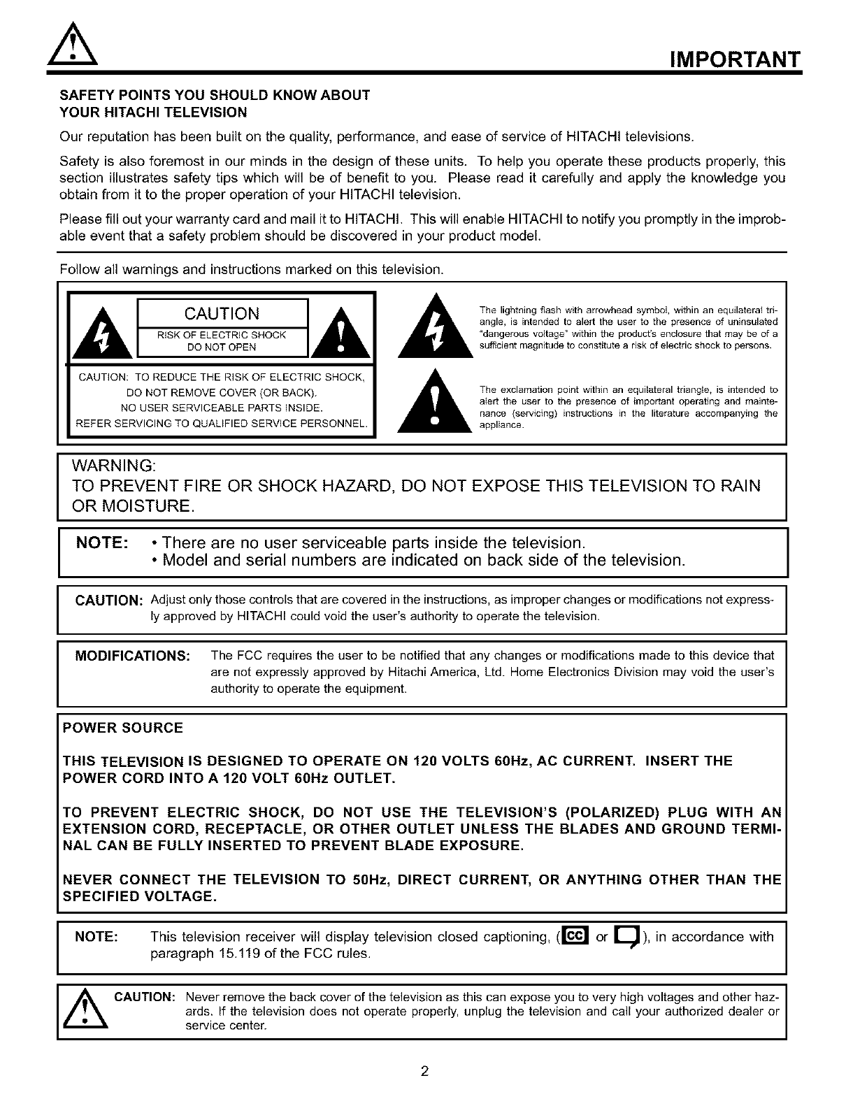 ly approved by HITACHI could void the user's authority to operate the television.