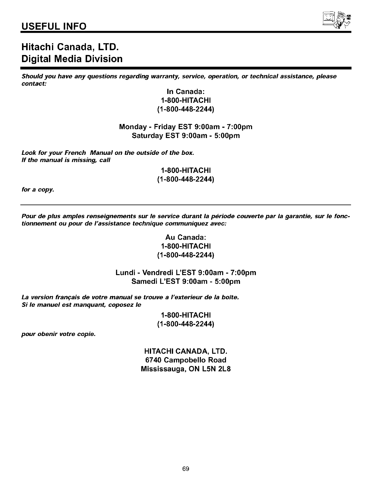 Please fill out your warranty card and mail it to HITACHI. This will enable HITACHI to notify you promptly in the improb-