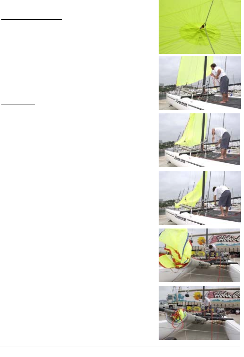 Attaching the spinnaker. Firstly tie the corners of the spinna-