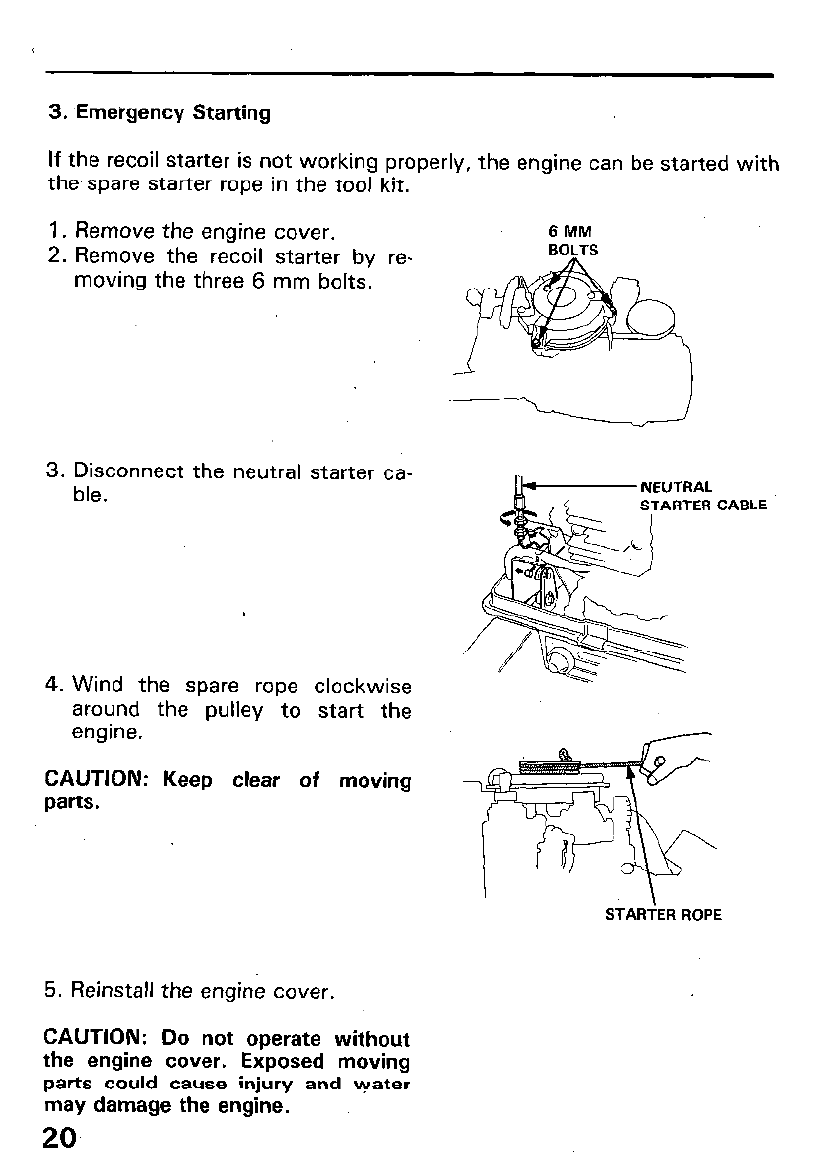 The engine can be started using the spare starter rope from the tool kit.