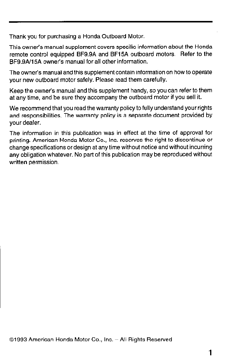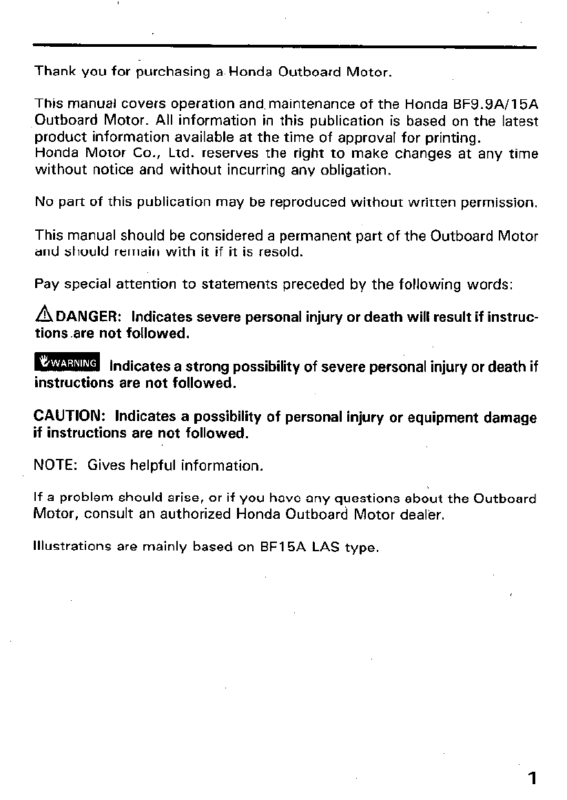 This manual covers operation and, maintenance of the Honda BF9.9A/15A