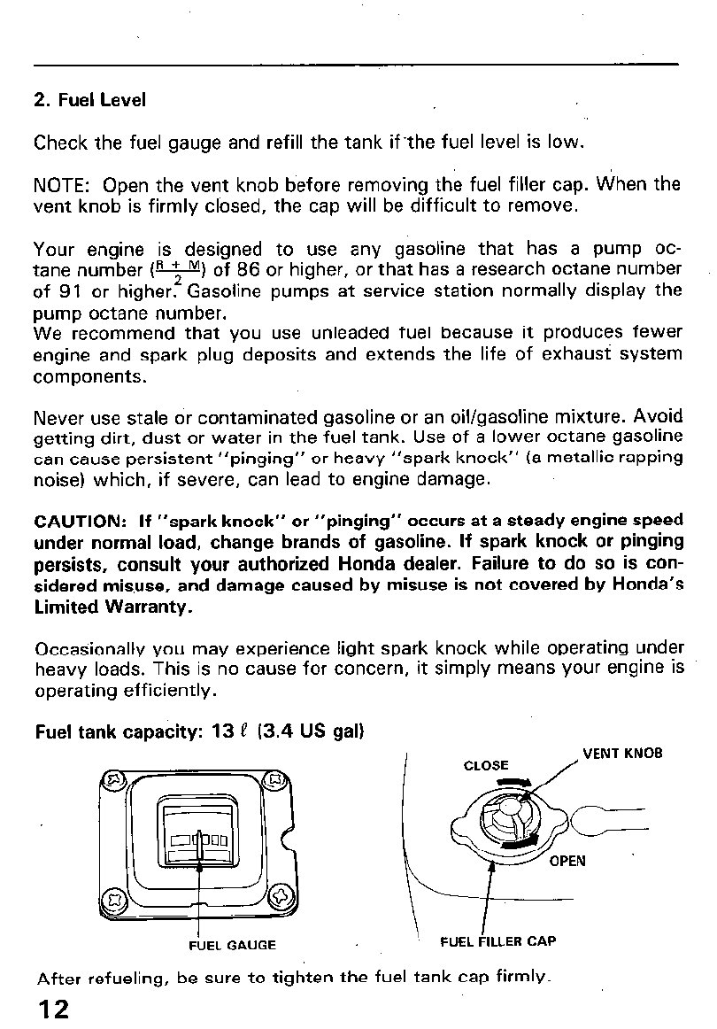Be careful not to spill any fuel while refueling. Spilled fuel or fuel vapor