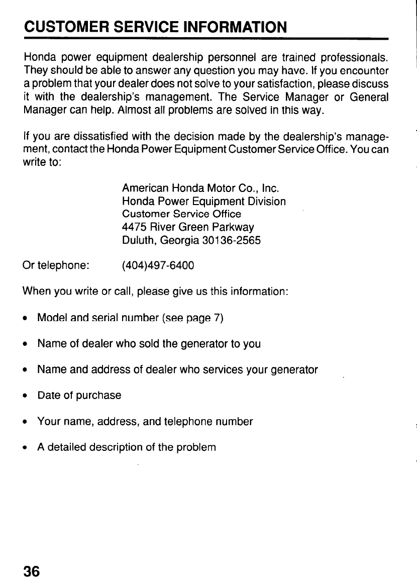 ment, contact the Honda Power Equipment Customer Service Office. You can