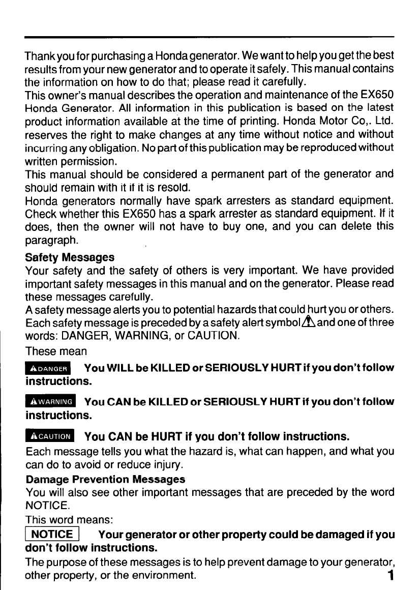 important safety messages in this manual and on the generator. Please read