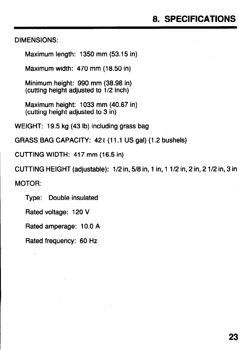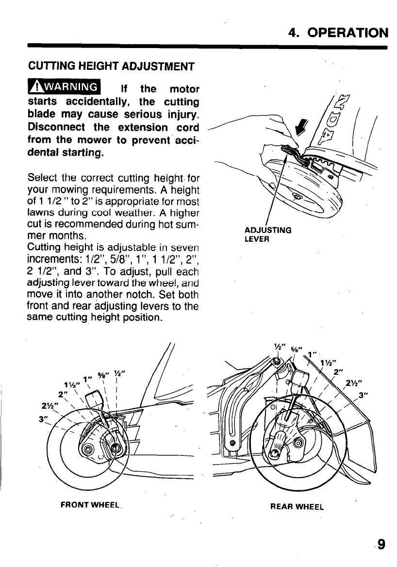 CUTTING HEIGHT (adjustable): l/2 in, 5/8 in, 1 in, 1 l/2 in, 2 in, 2 l/2 in, 3 in