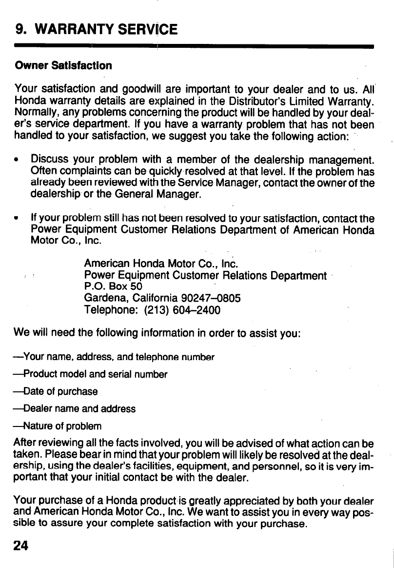 Power Equipment Customer Relations Department of American Honda