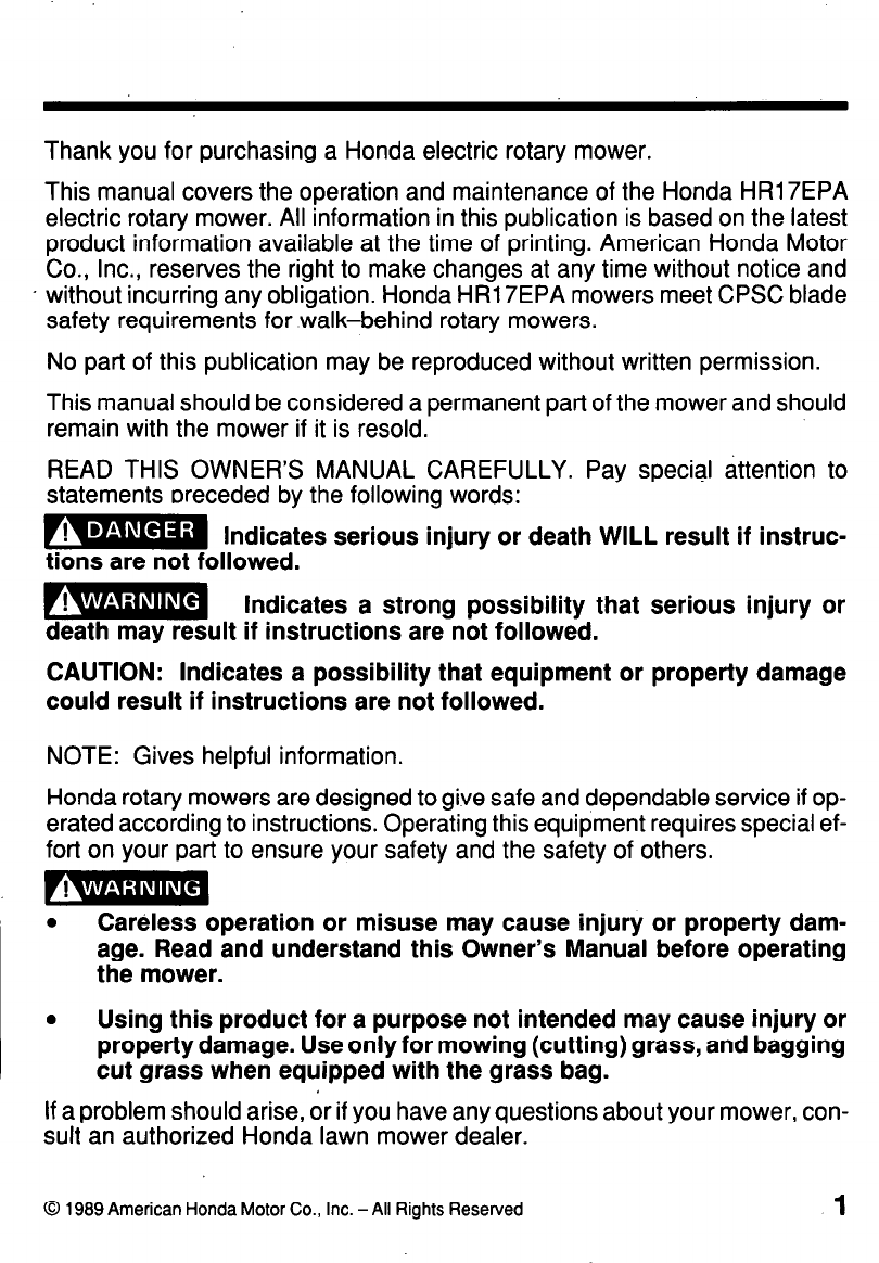 This manual covers the operation and maintenance of the Honda HR17EPA