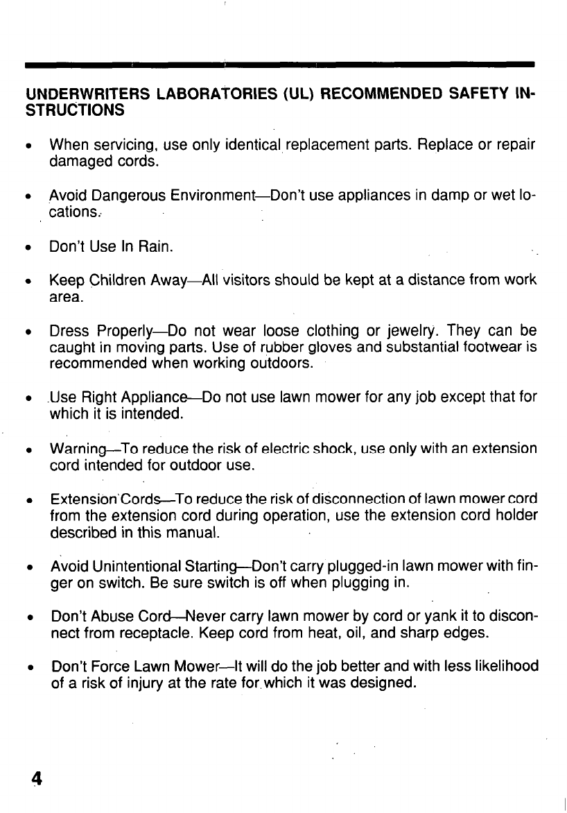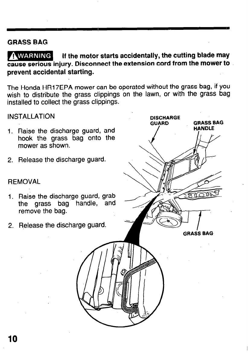 - NEVER REMOVE DISCHARGE GUARD. BE SURE GRASS BAG IS