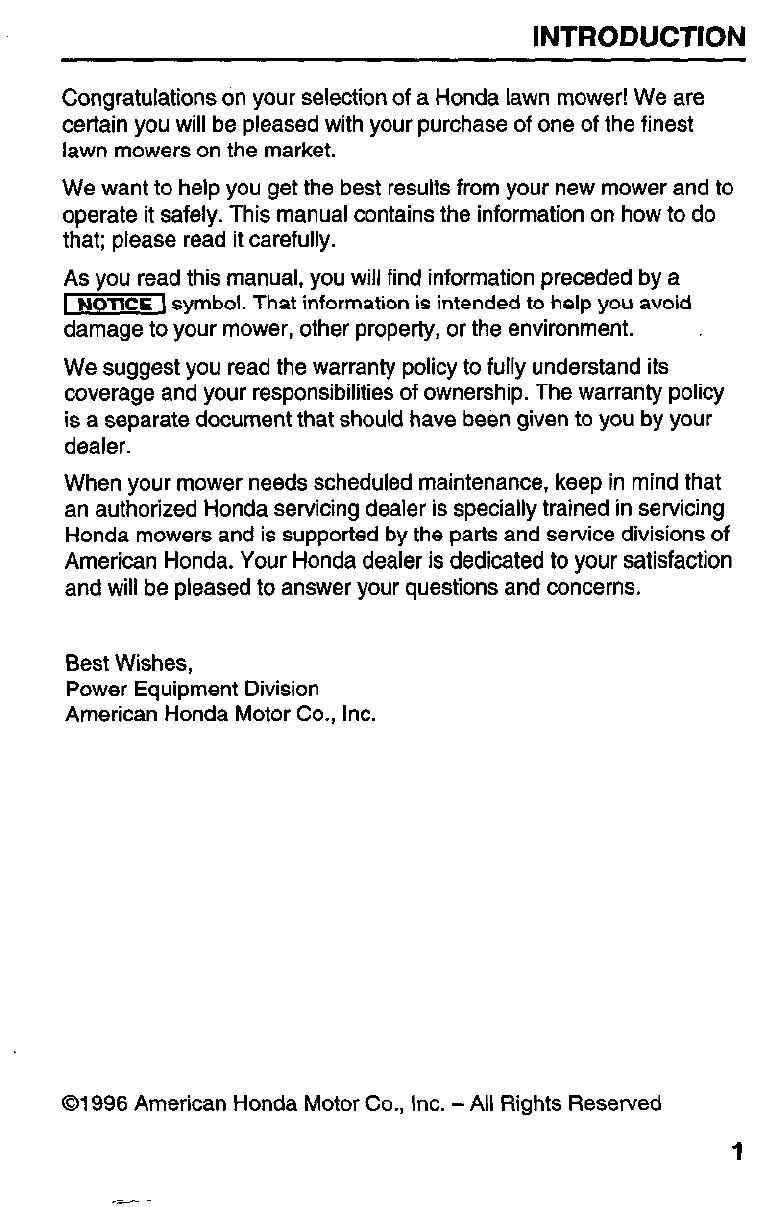 Congratulations on your selection of a Honda lawn mower! We are