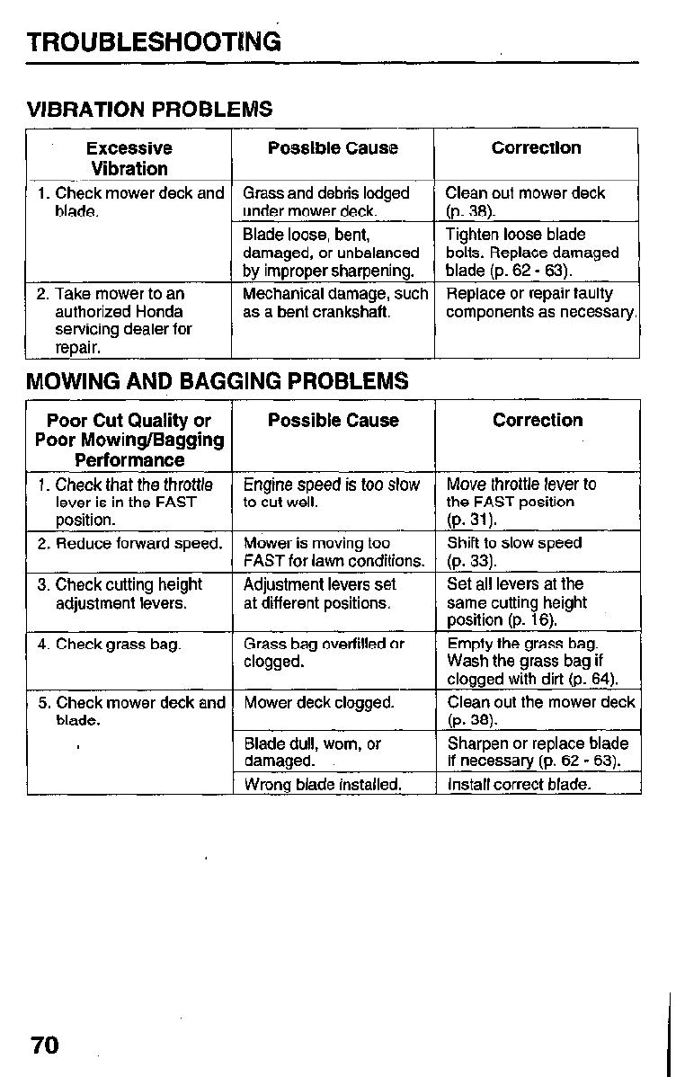 Check blade and bolt tightness (pages 19 & 63).