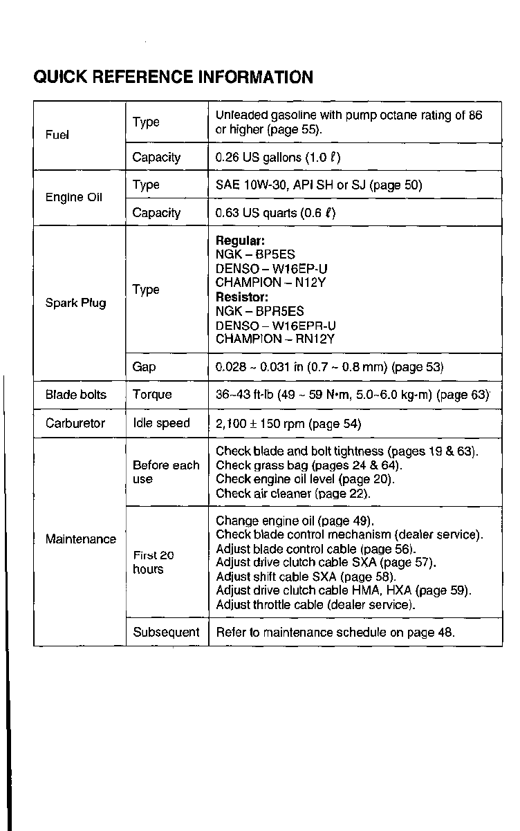 QUICK REFERENCE INFORMATION