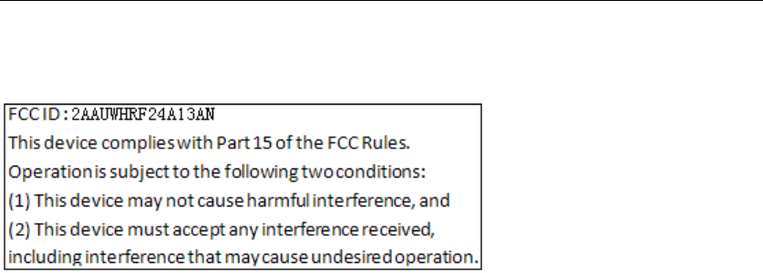 Transmitter Module FCC ID: 2AAUWHRF24A13AN” or “Contains FCC ID: