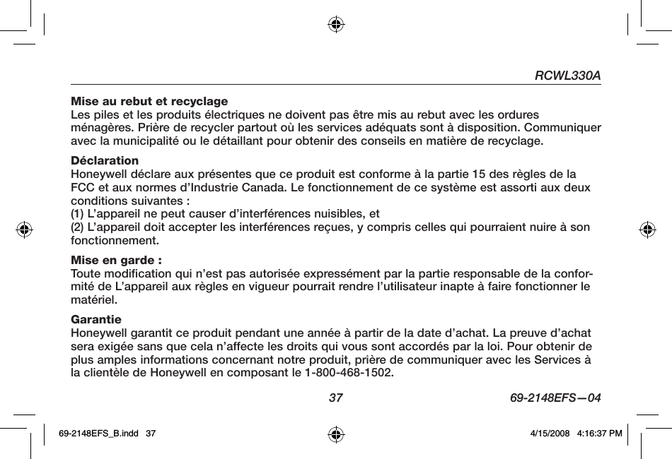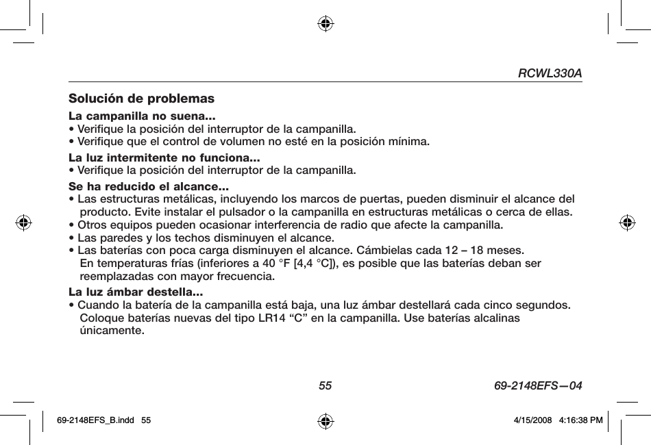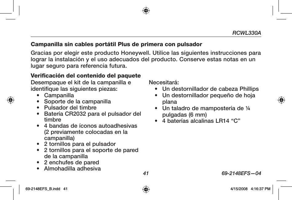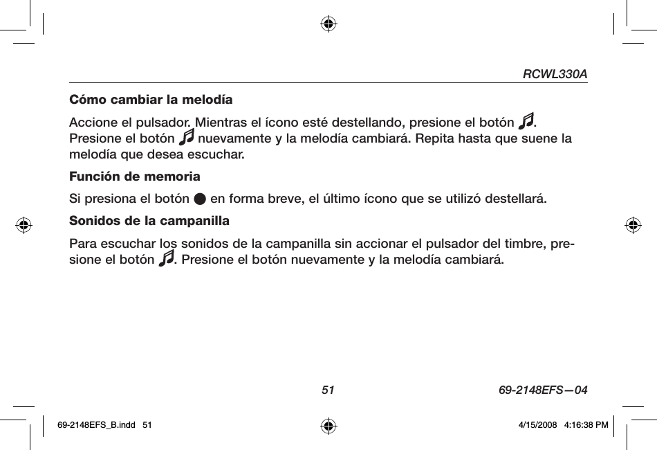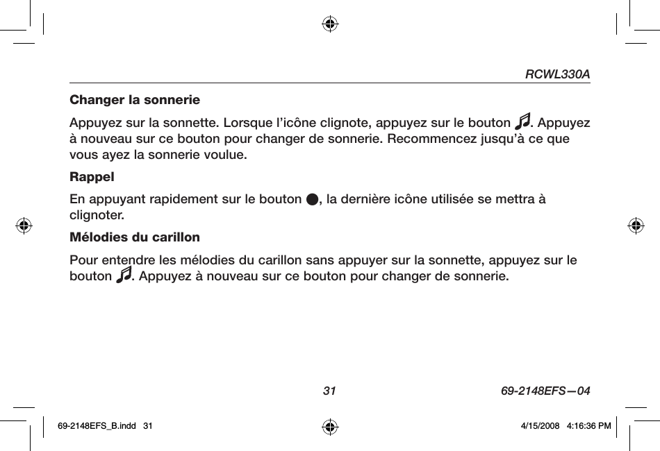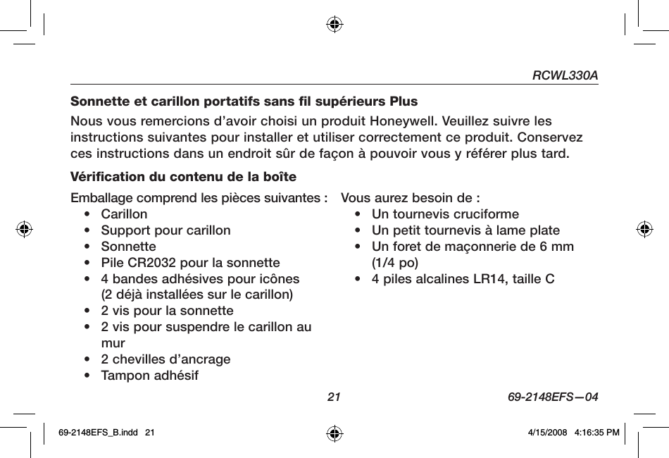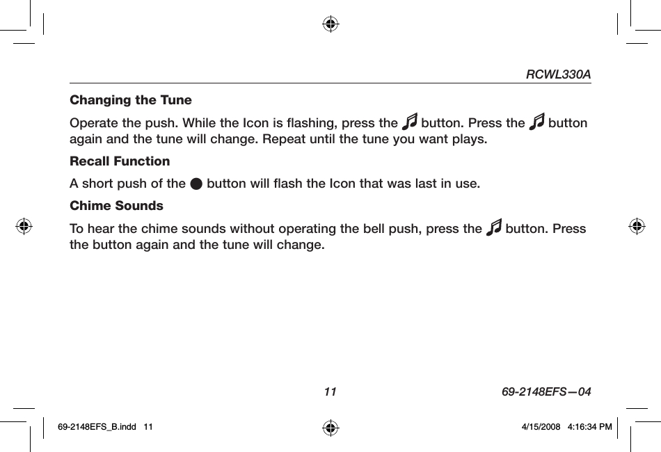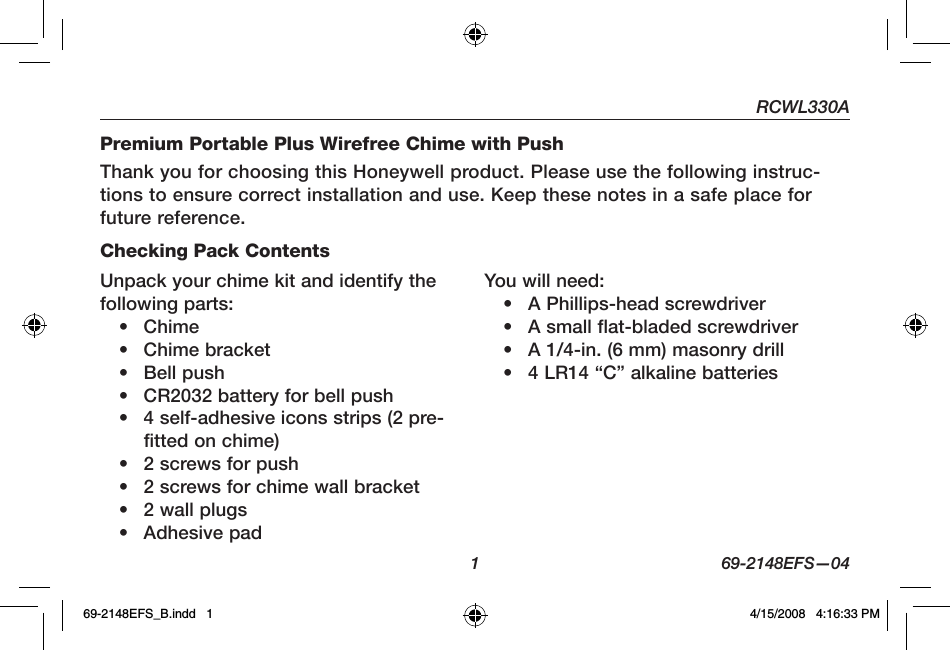 Honeywell 51459SL Premium Portable Plus Wireless Chime User Manual 69 2148EFS 04 RCWL330A