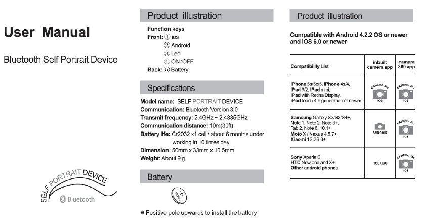 HongTaiDingYe Electronic BSP-101 Selfie Remote User Manual
