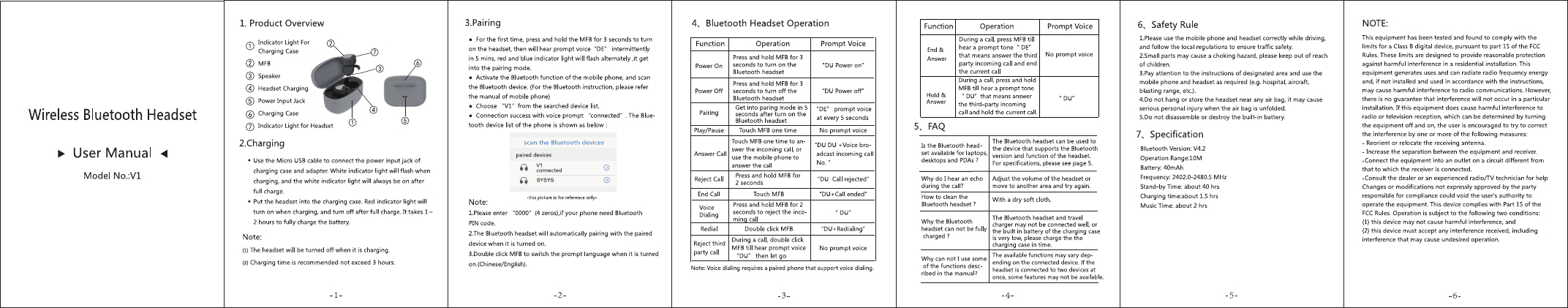 Hongnanke Communication Equipment V1 Bluetooth Headset User Manual
