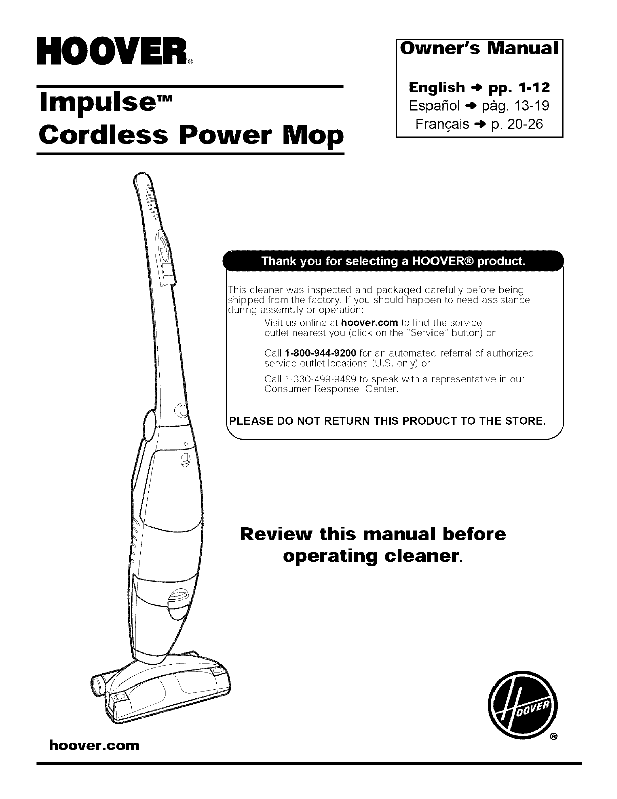 User Manual: Hoover H2510 H2510 HOOVER CORDLESS POWER MOP - Manuals and Guides View the owners manual for your HOOVER CORDLESS POWER MOP #H2510. Home:Vacuums & Floor Care Parts:Hoover Parts:Hoover CORDLESS POWER MOP Manual
