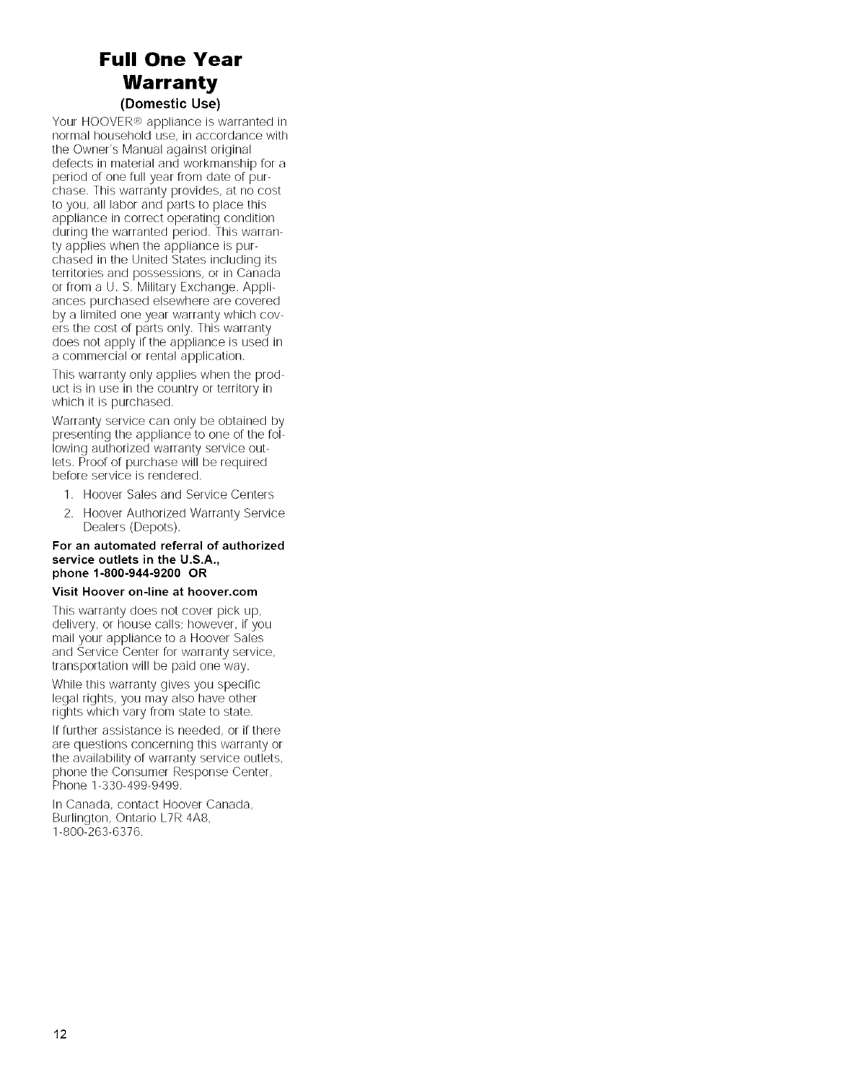 it to a Hoover Sales & Service Center or Authorized Hoover Waranty Service