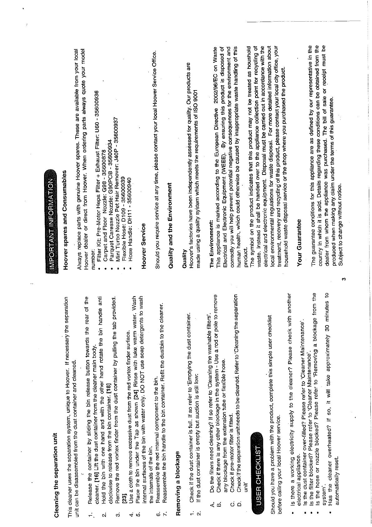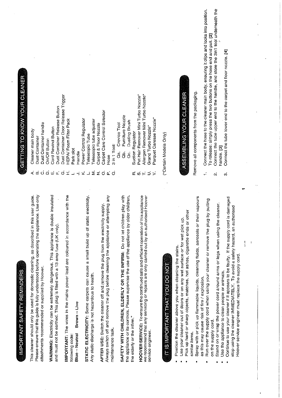 Hoover Vacuum Cleaner Rush Pets TCR4213 Instruction Manual Product Code 39000616 TCR4233