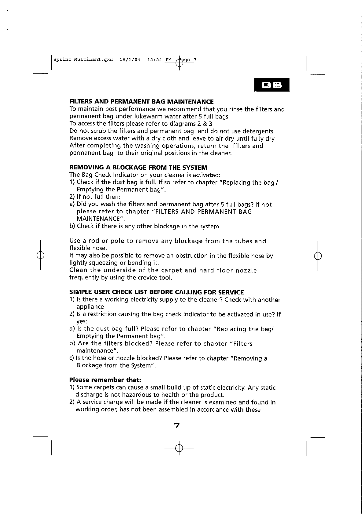 Hoover Vacuum Cleaner Sprint TW1750 Instruction Manual Product Code 39000248
