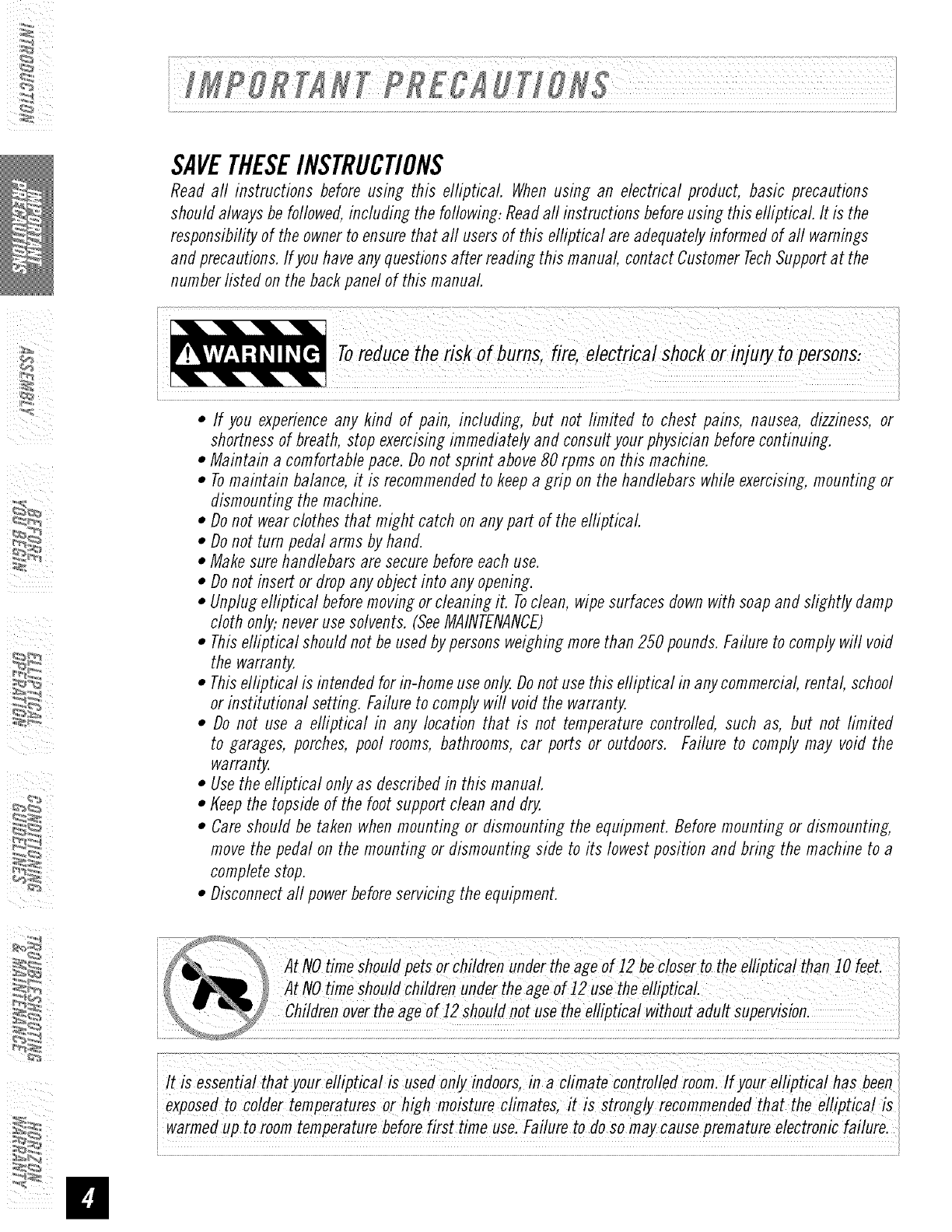 • This elliptical should not be used by persons weighing more than 250 pounds. Failure to comply will void