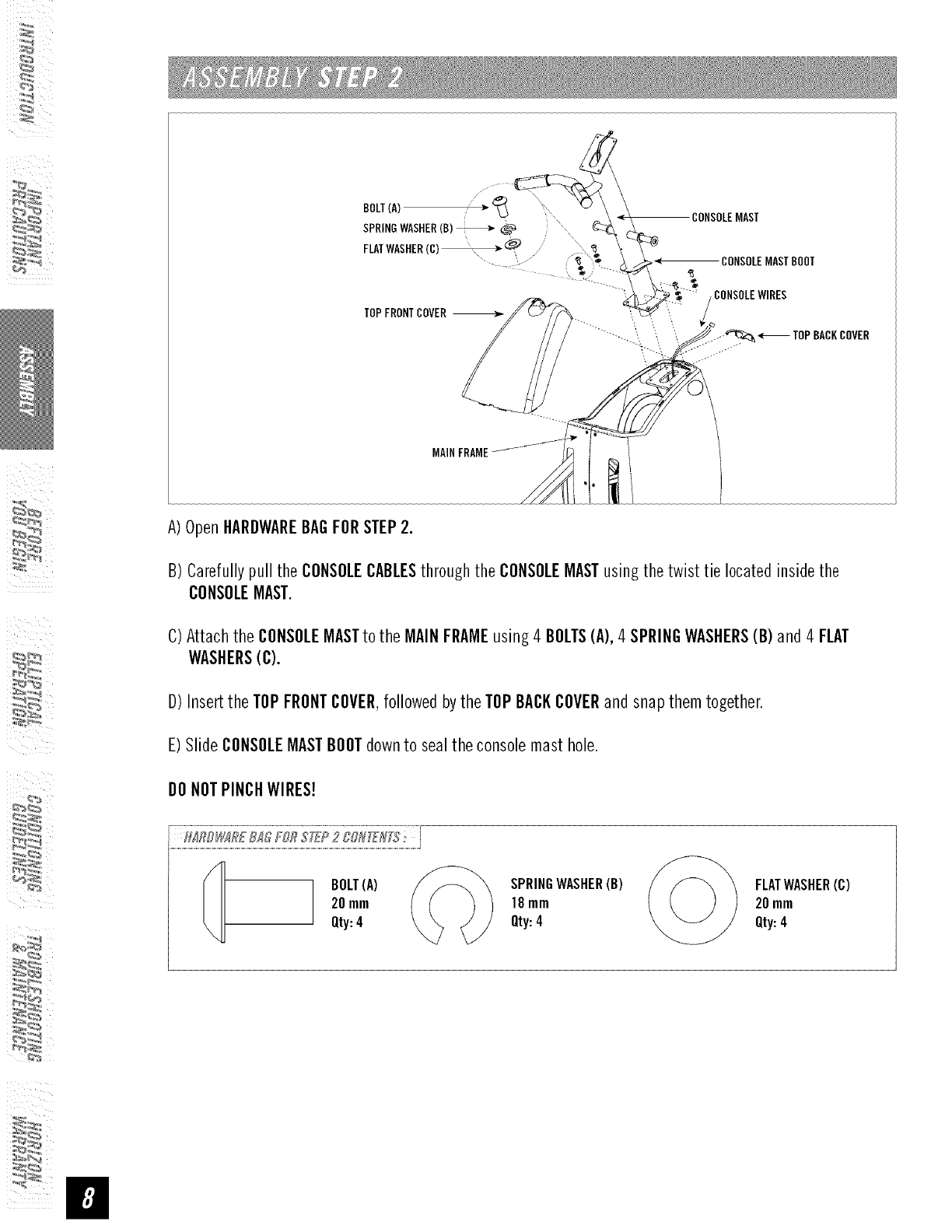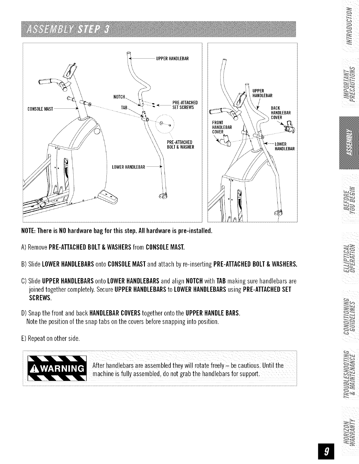 • Tomaintain balance, it is recommended to keep a grip on the handlebars while exercising, mounting or