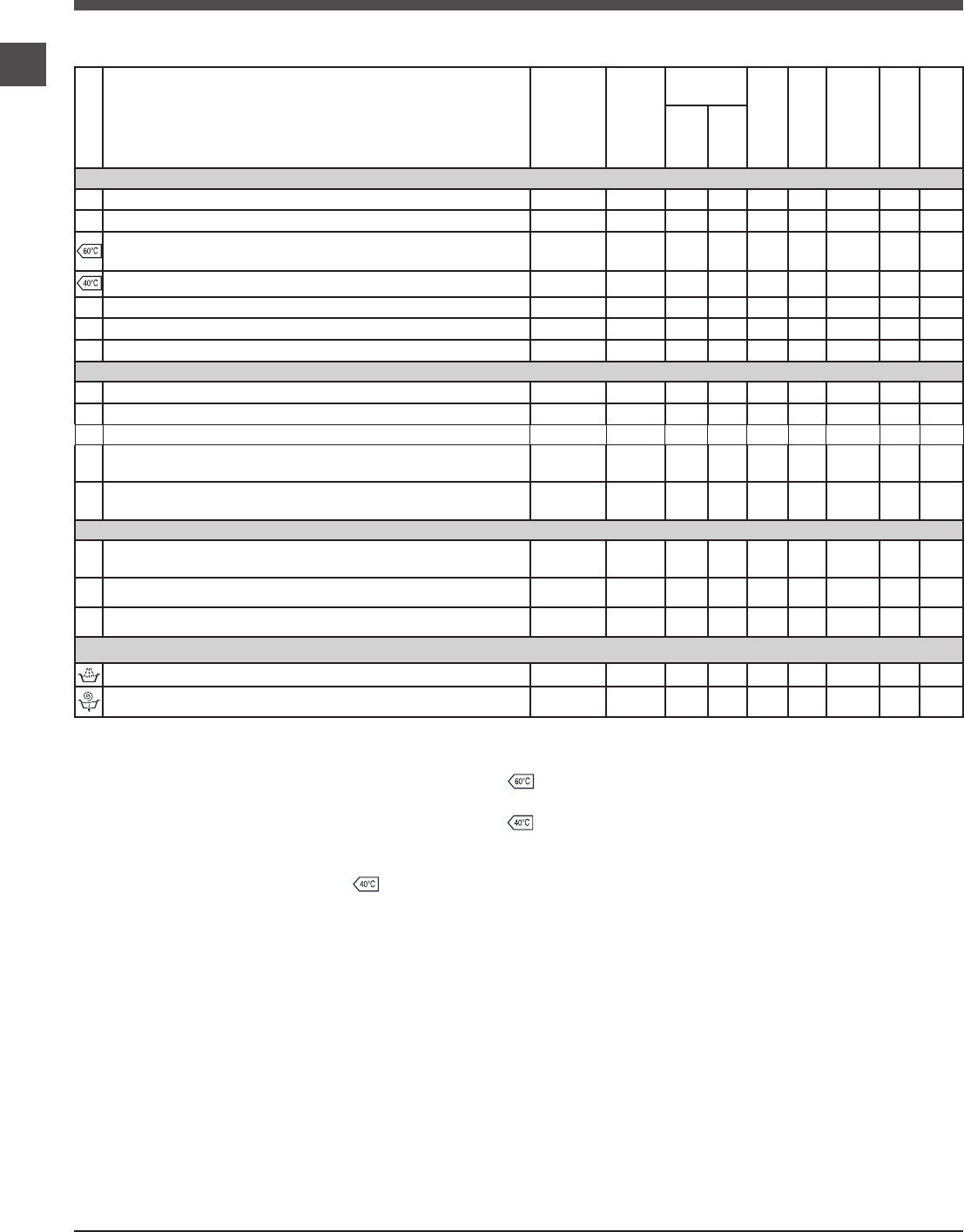 Table of wash cycles