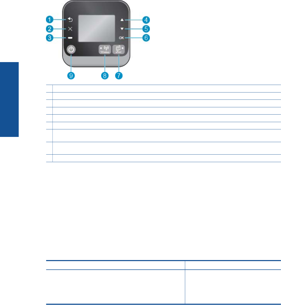 8ePrint status light and button: White light indicates ePrint connection. Pressing button displays the Web Services Menu