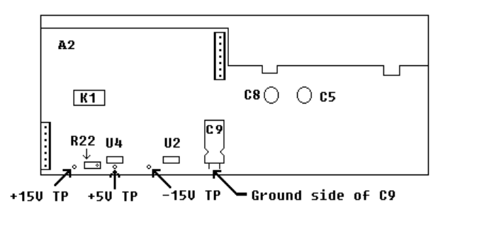 (1) Connect multimeter INPUT HI to -15 V TP (fig. 5) and LO to ground side of C9