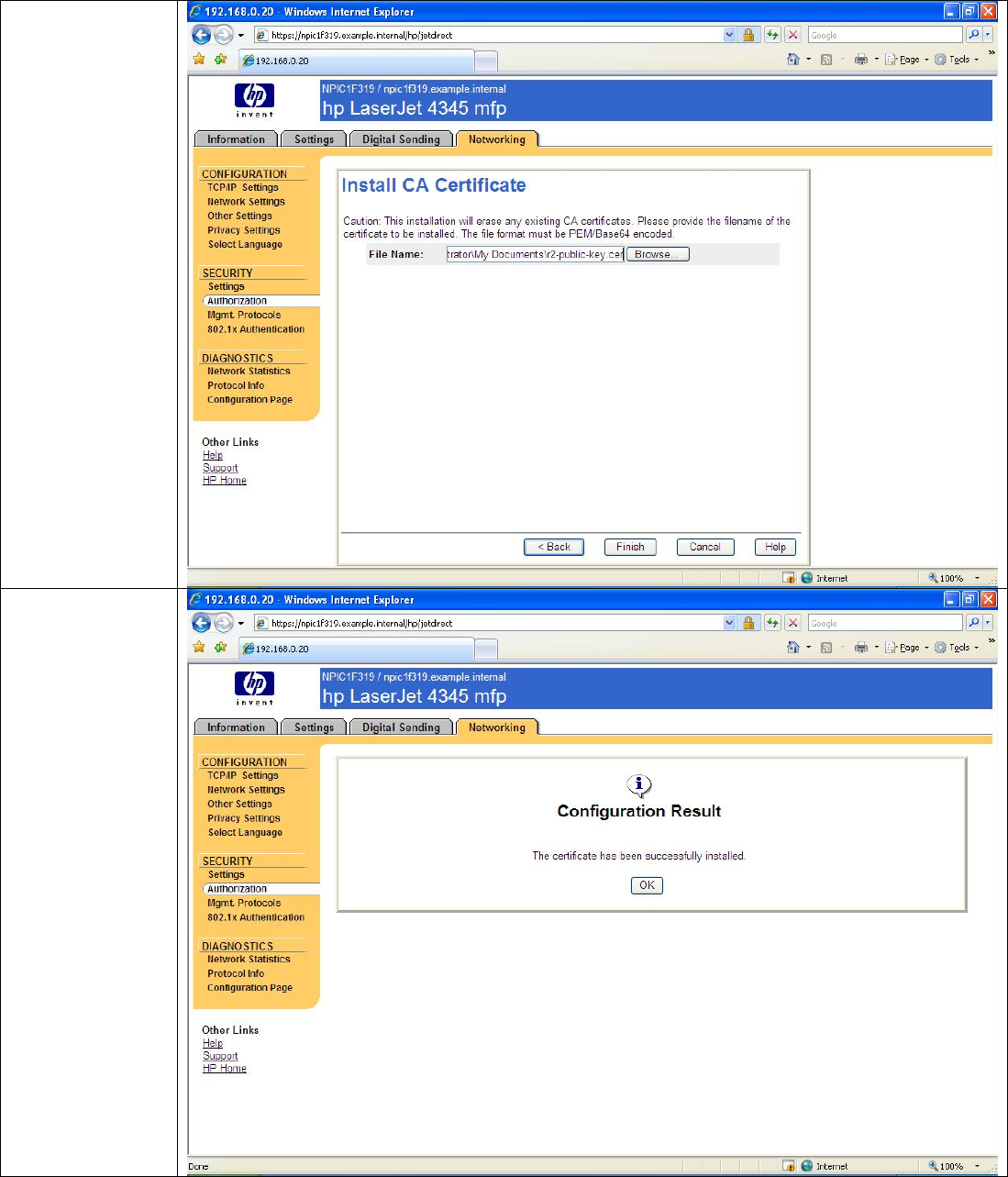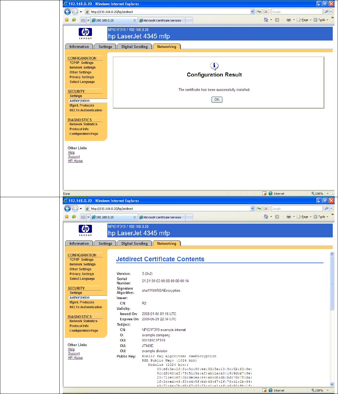 private key for Jetdirect always remains private. Be sure that the Common Name matches