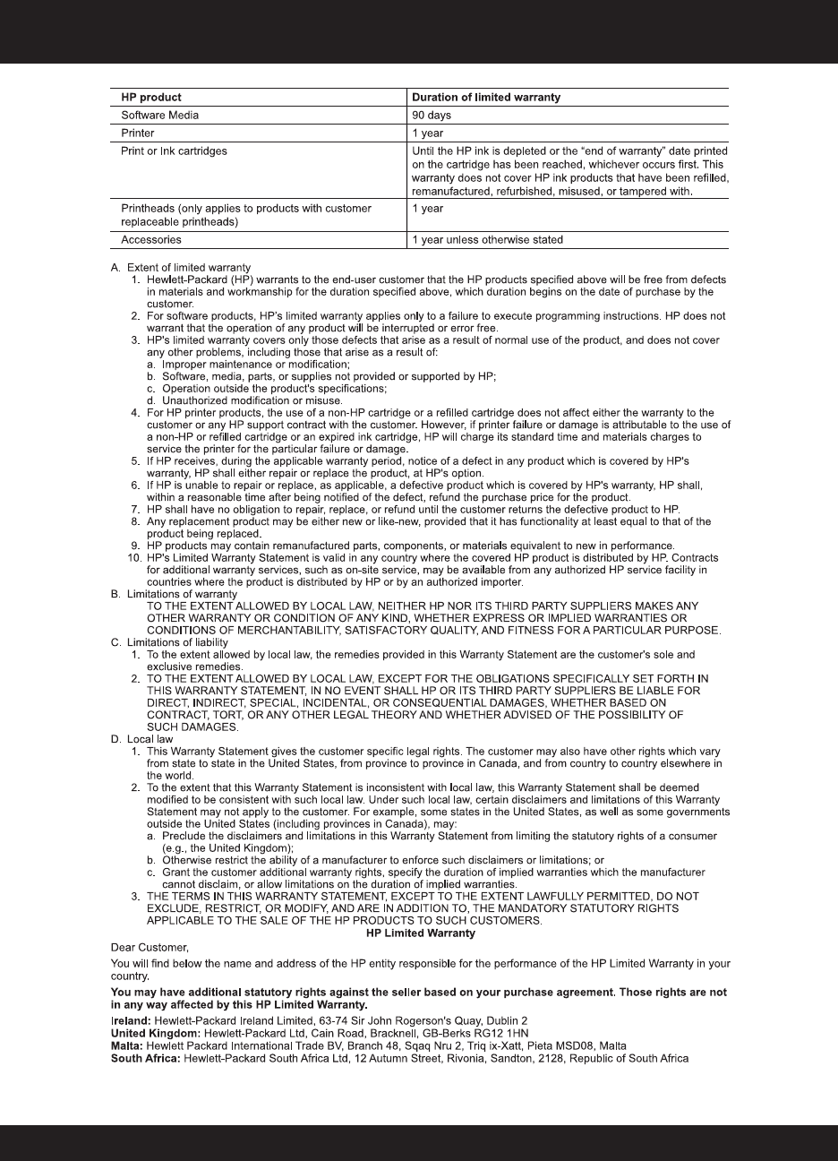 HP printer limited warranty statement