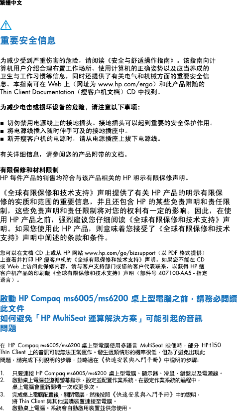 copy of the Worldwide Limited Warranty and Technical Support statement for the HP thin client products (part number