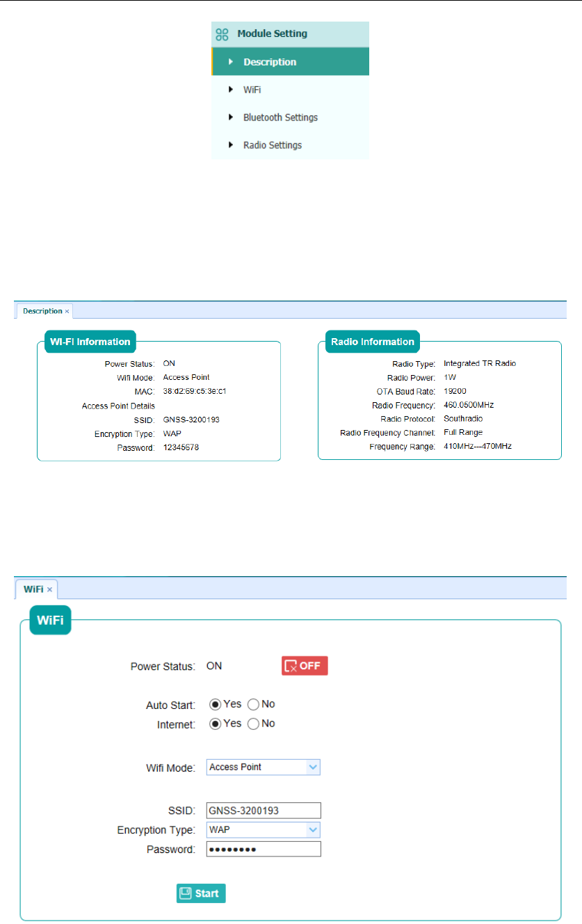 Use this menu to check module information, configure WiFi, bluetooth, radio related