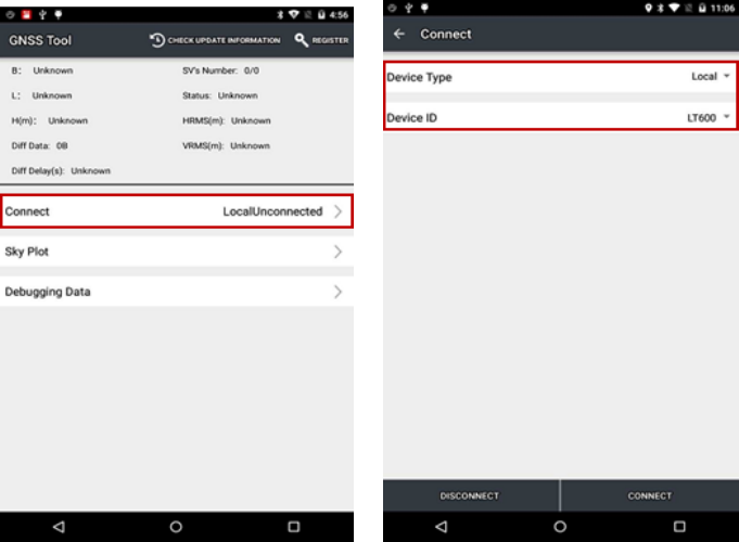 1. OpenGNSSTool,click[Connect]menuandselect[DeviceType]and[ConnectionType]/