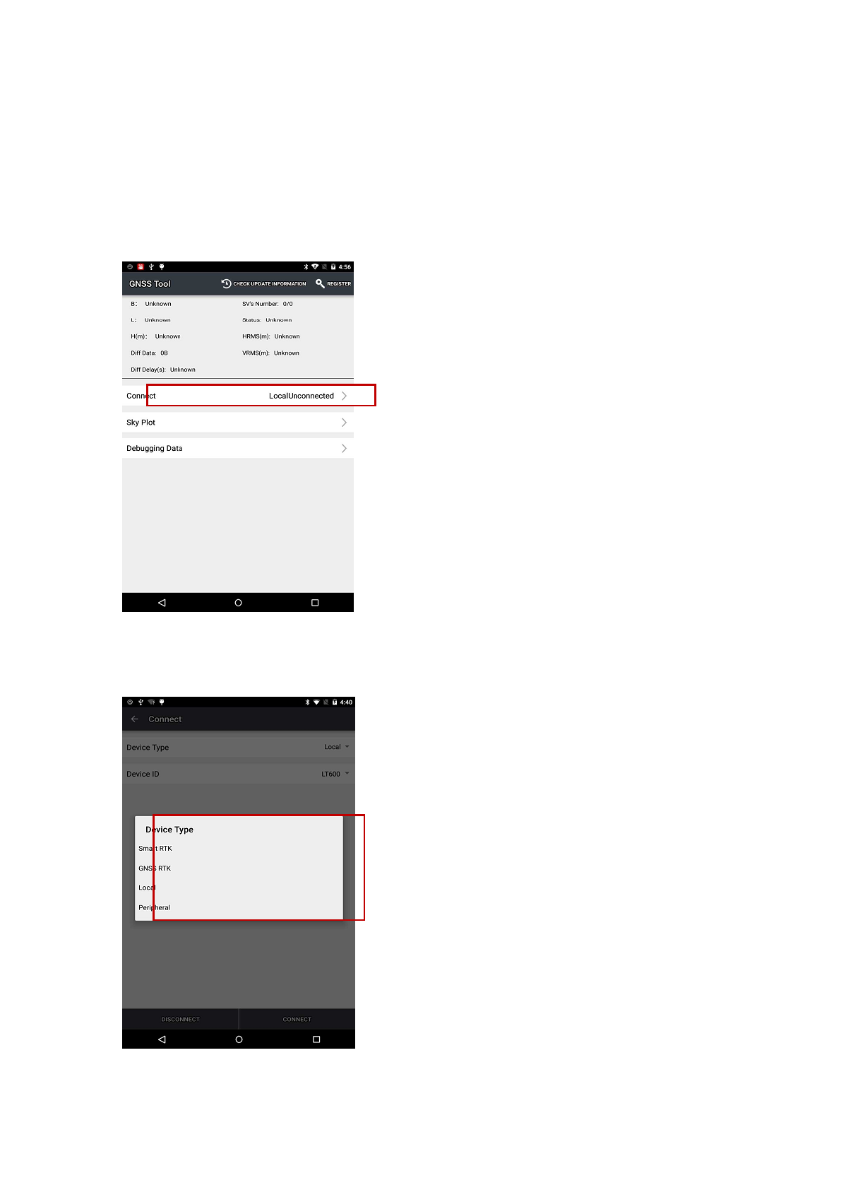1. OpenGNSSTool and click [Connect] menu and select [Device Type] and [Connection Type]/[Device ID] in