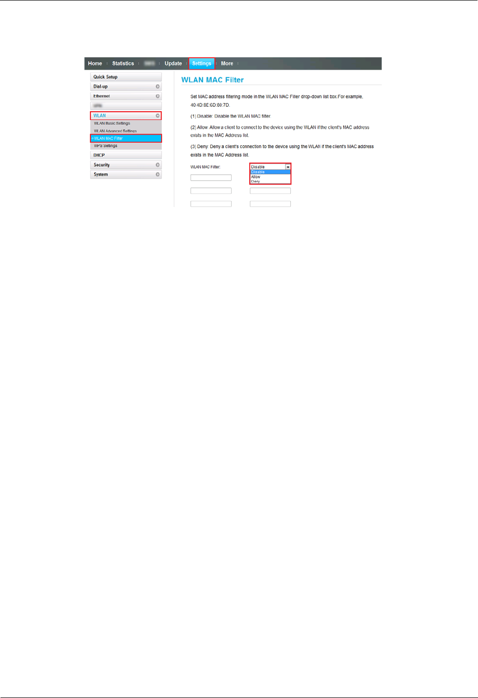 Log in to the Web UI management page and choose Settings > WLAN > WLAN MAC
