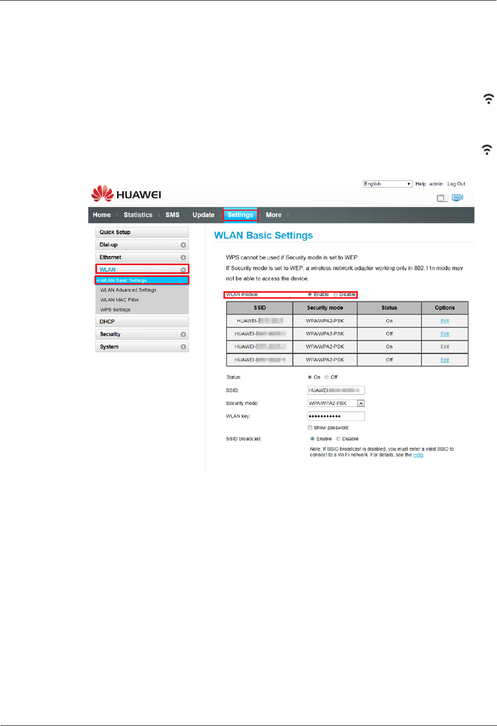 Settings > WLAN > WLAN Basic Settings to turn Wi-Fi on. The Wi-Fi indicator on the