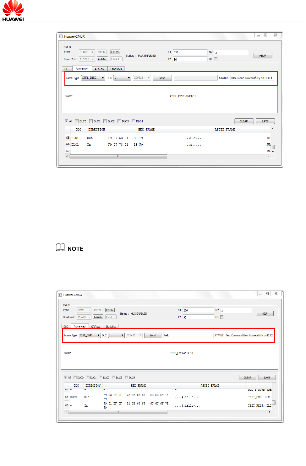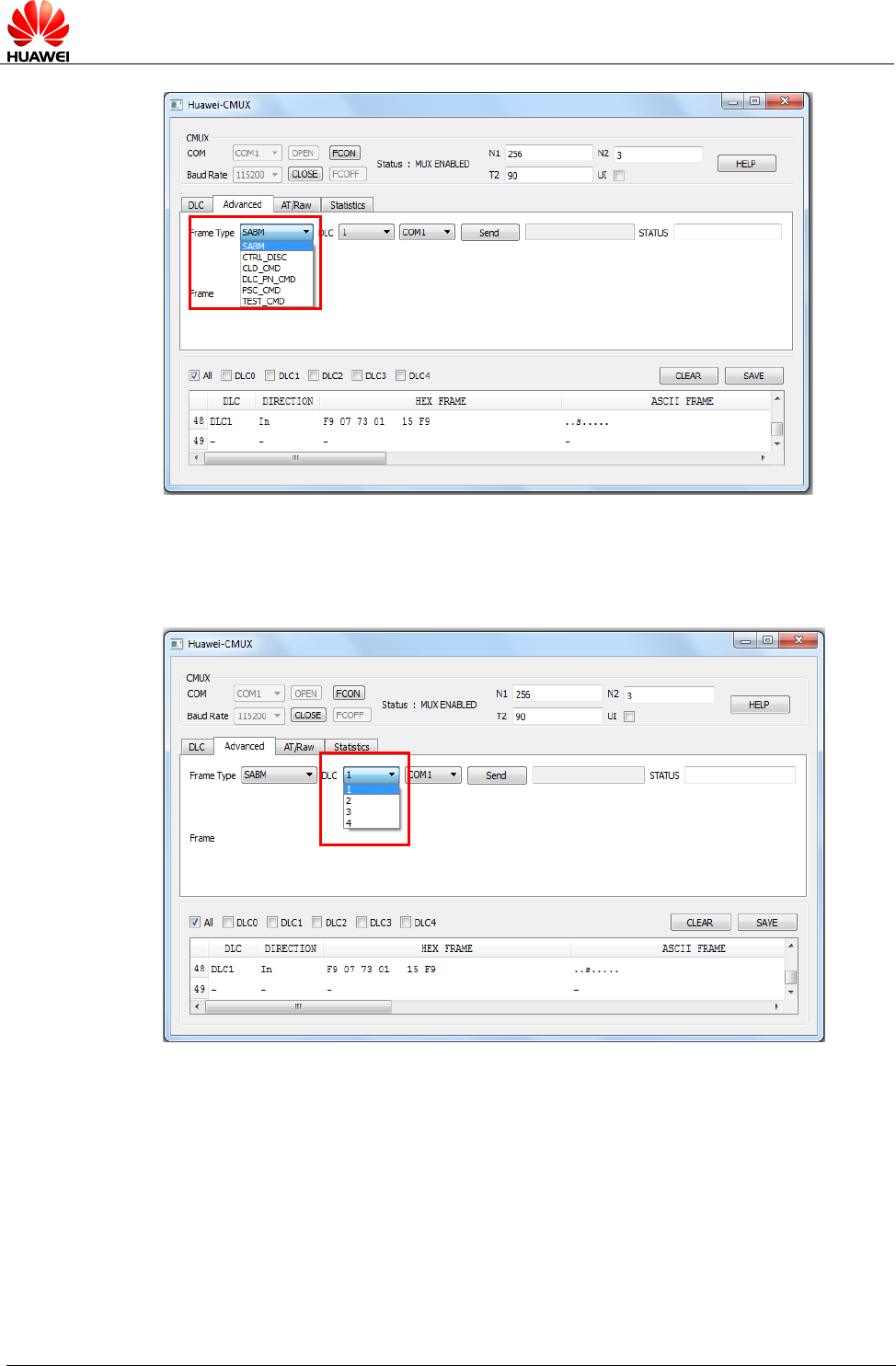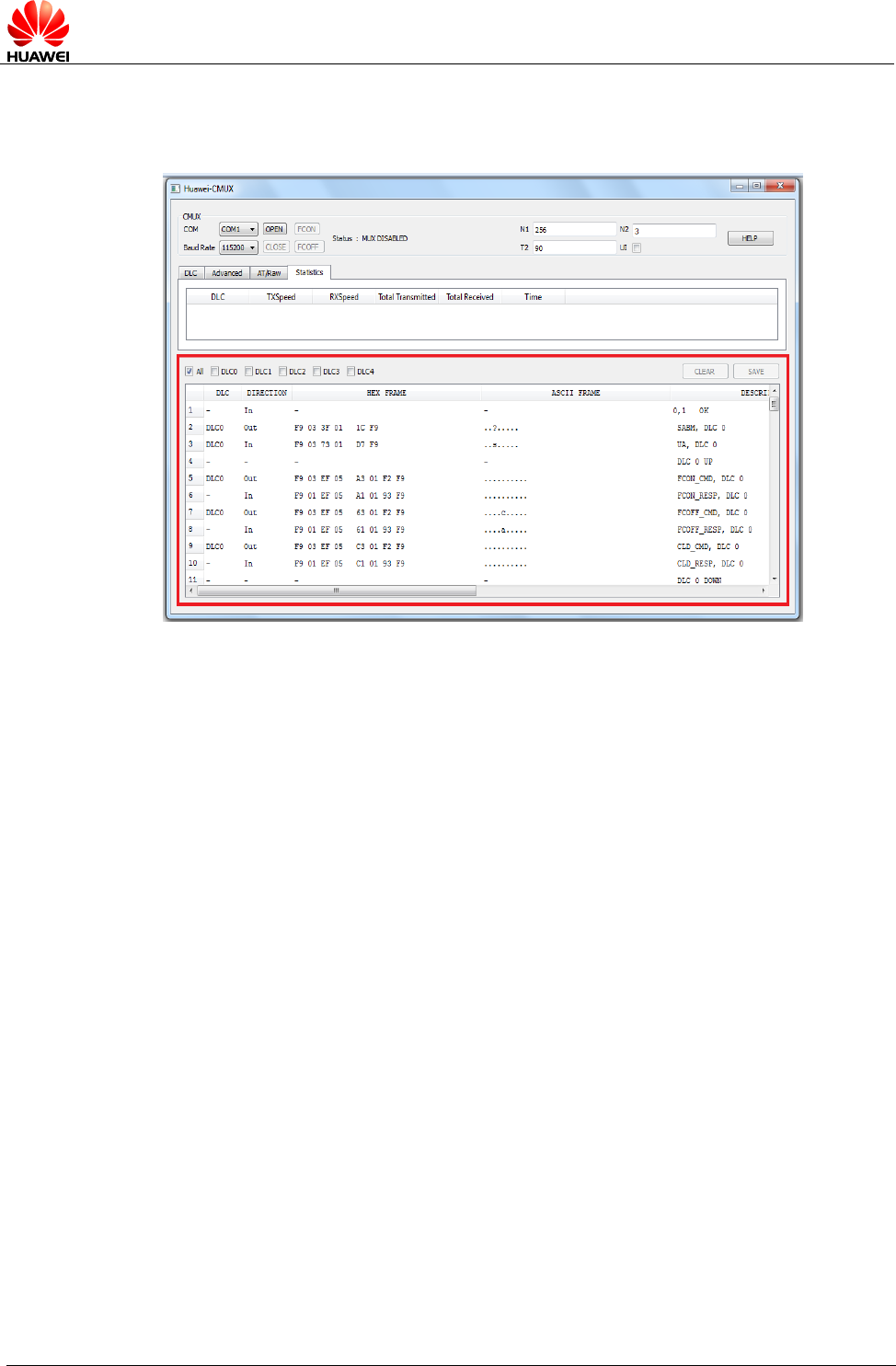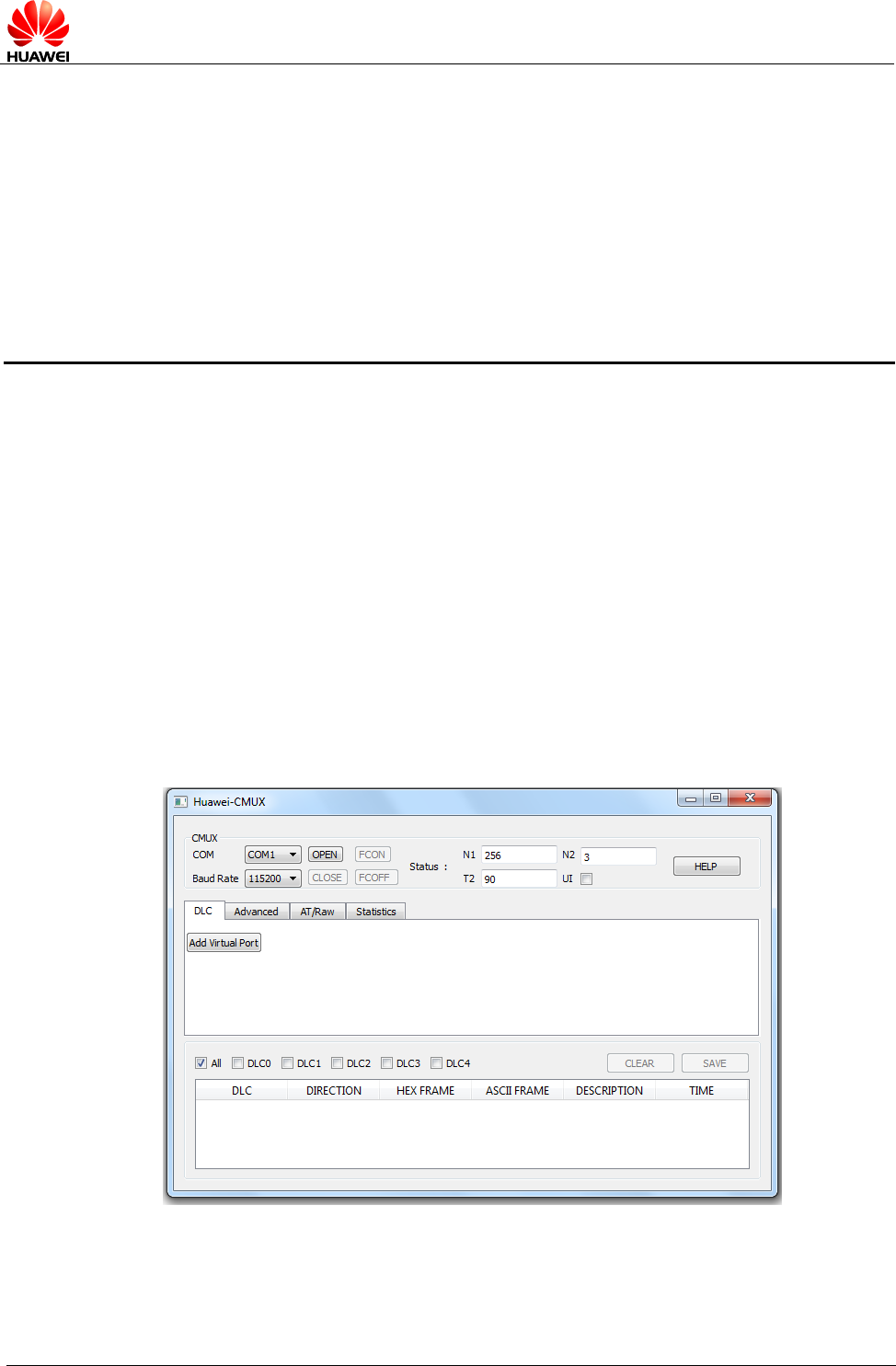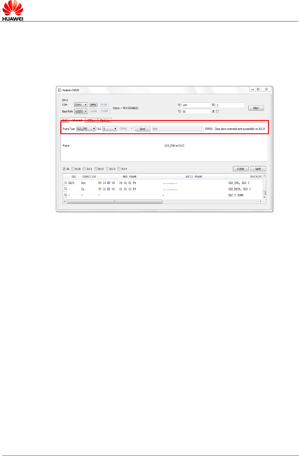 - Huawei module supports the CMUX basic option and UIH frames. The serial port