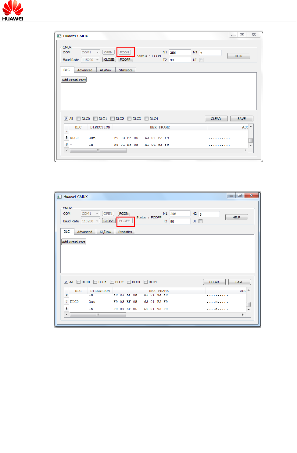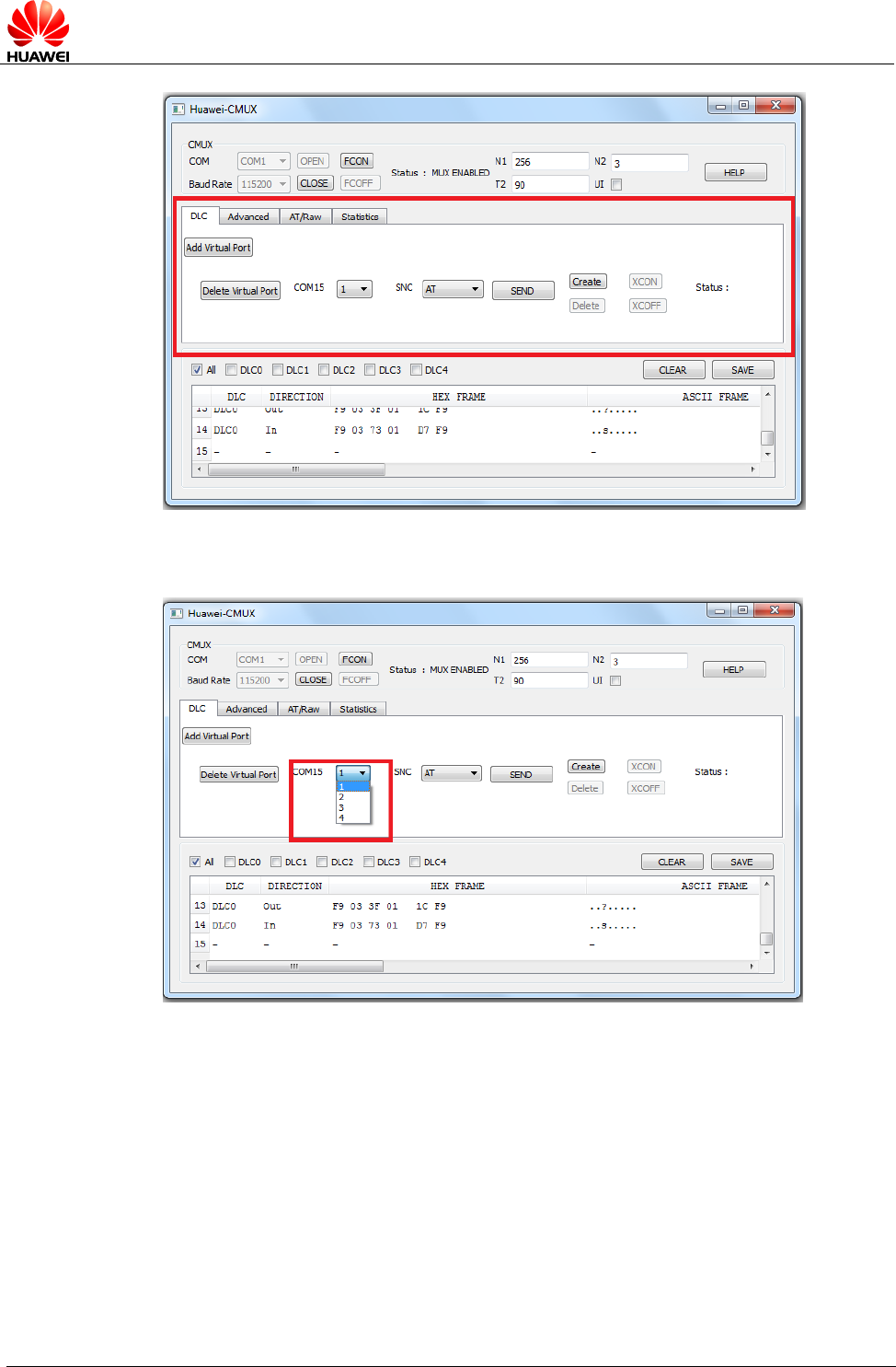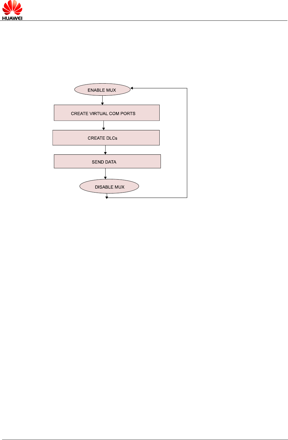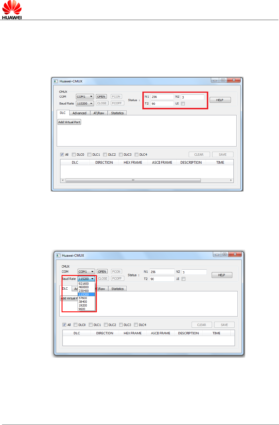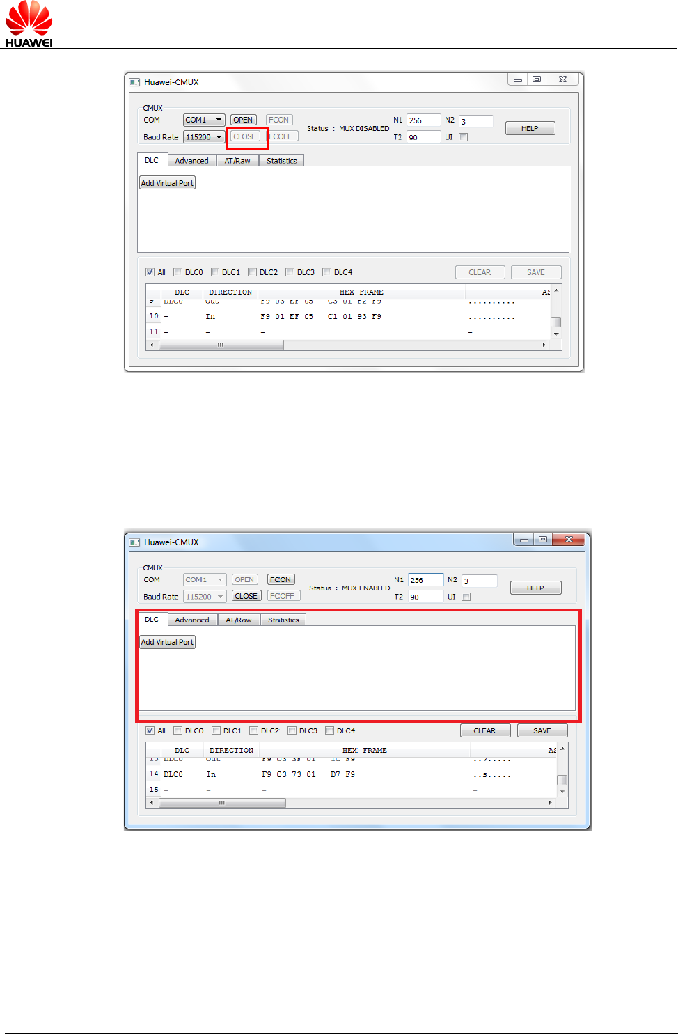- Huawei module supports the CMUX basic option and UIH frames. The serial port
