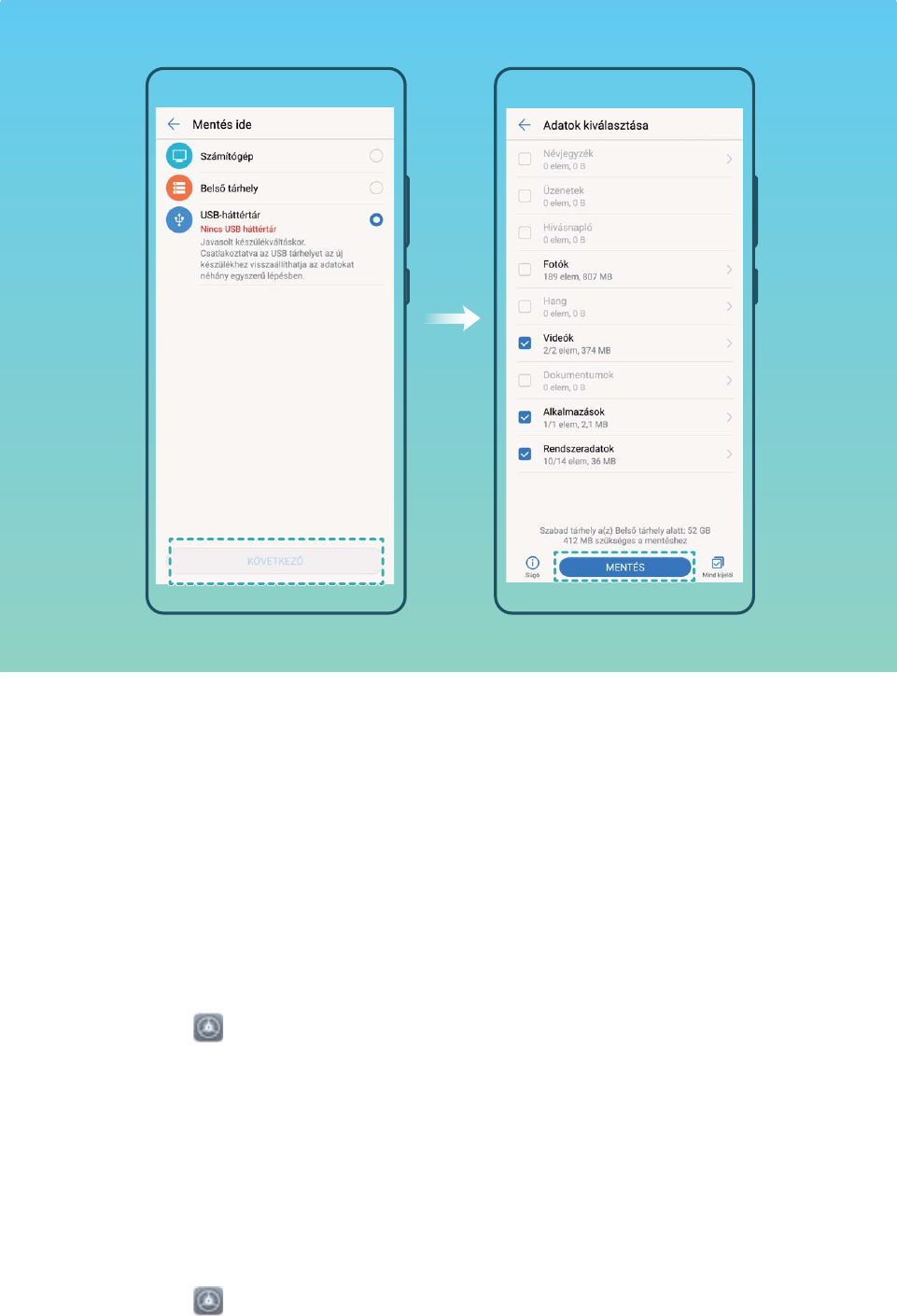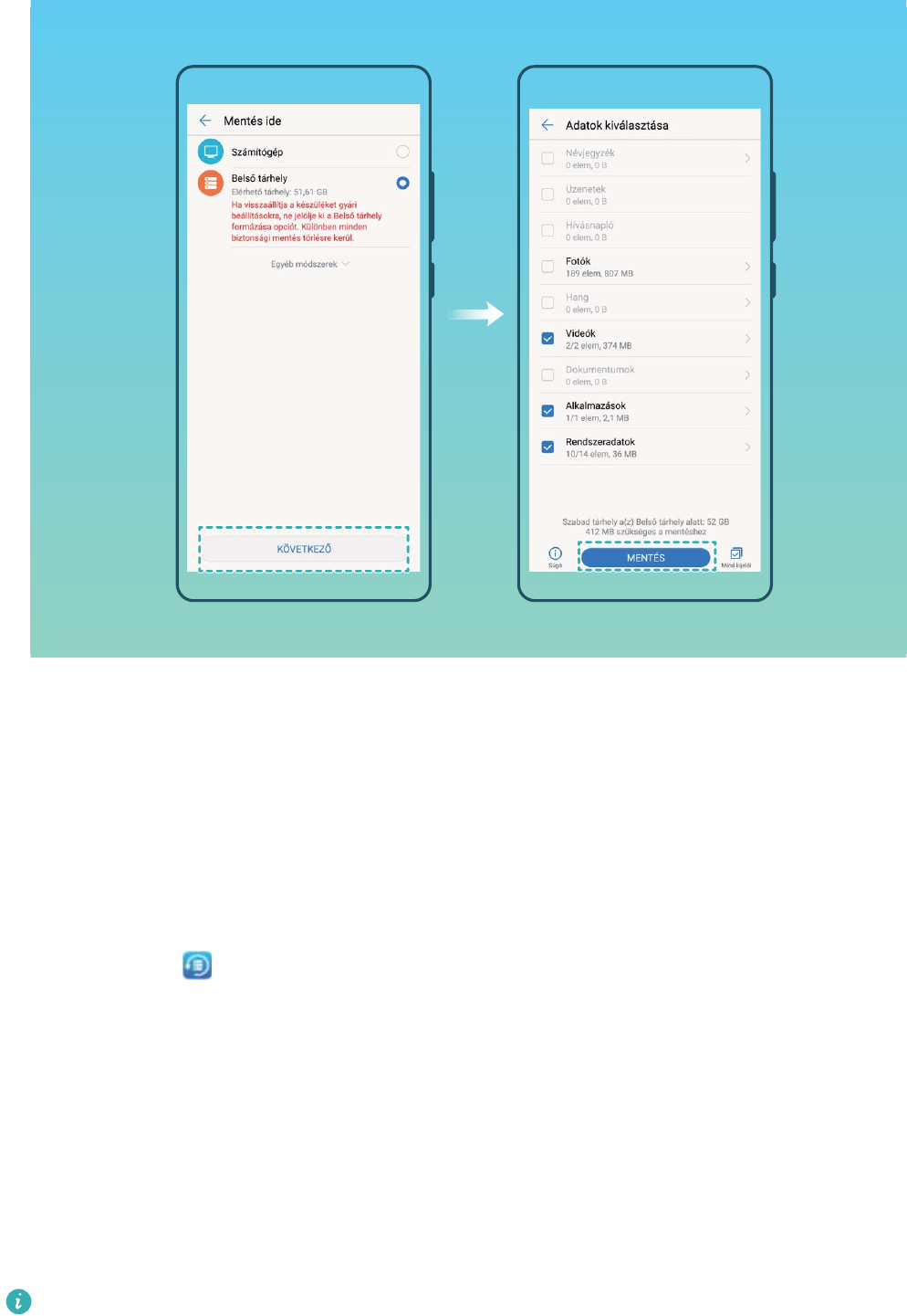 - Az adatok biztonsági mentése az eszköz belső tárhelyére