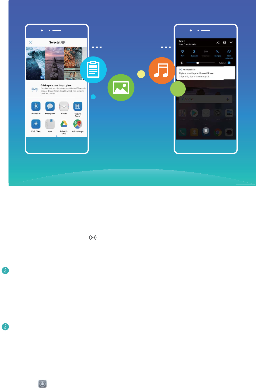 - Utilizarea funcției Huawei Share pentru partajarea rapidă a fișierelor între dispozitive Huawei