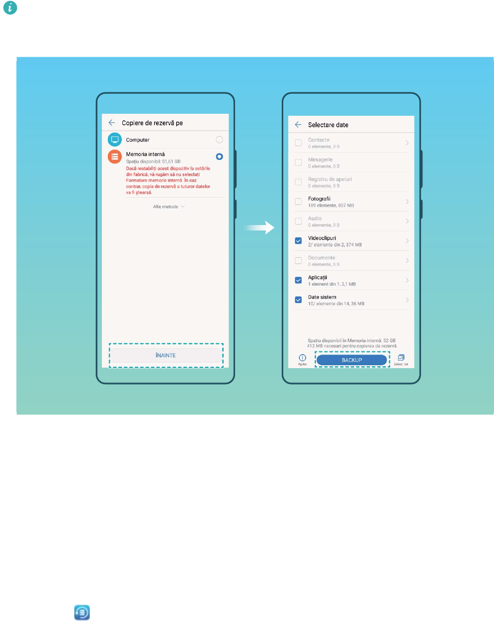 - Crearea unei copii de rezervă a datelor în memoria internă a dispozitivului dvs.