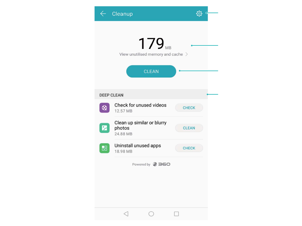 l(Recommended) Clear storage space: Select Storage cleaner to enter the Cleanup screen and