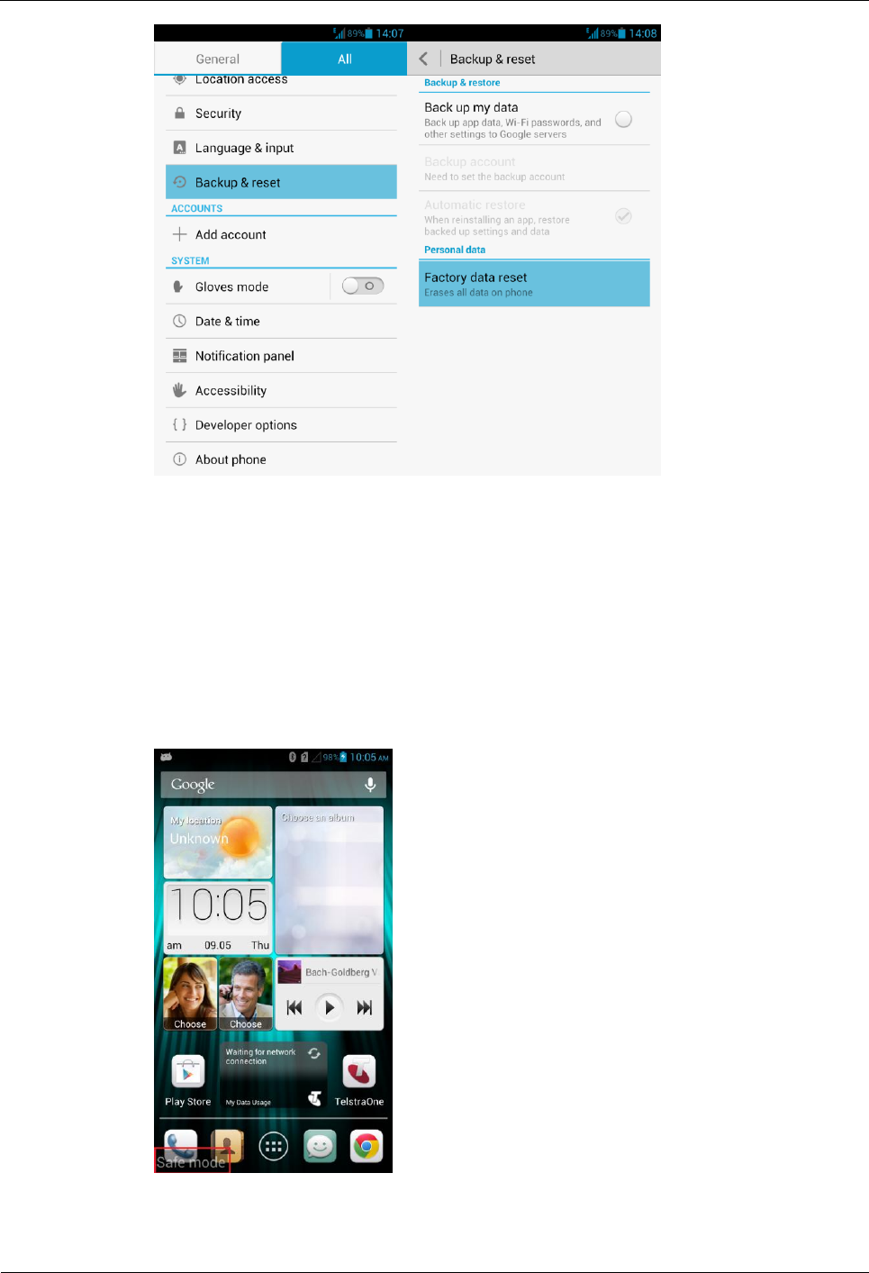 To restore factory settings, touch Settings > Backup & reset > Factory data reset > Reset