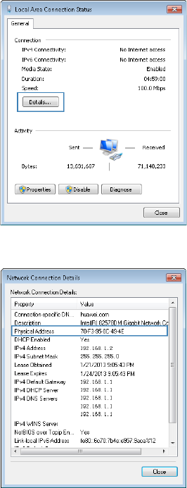 3. In Network Connection Details, find the line similar to Physical Address 70-F3-95-0C-